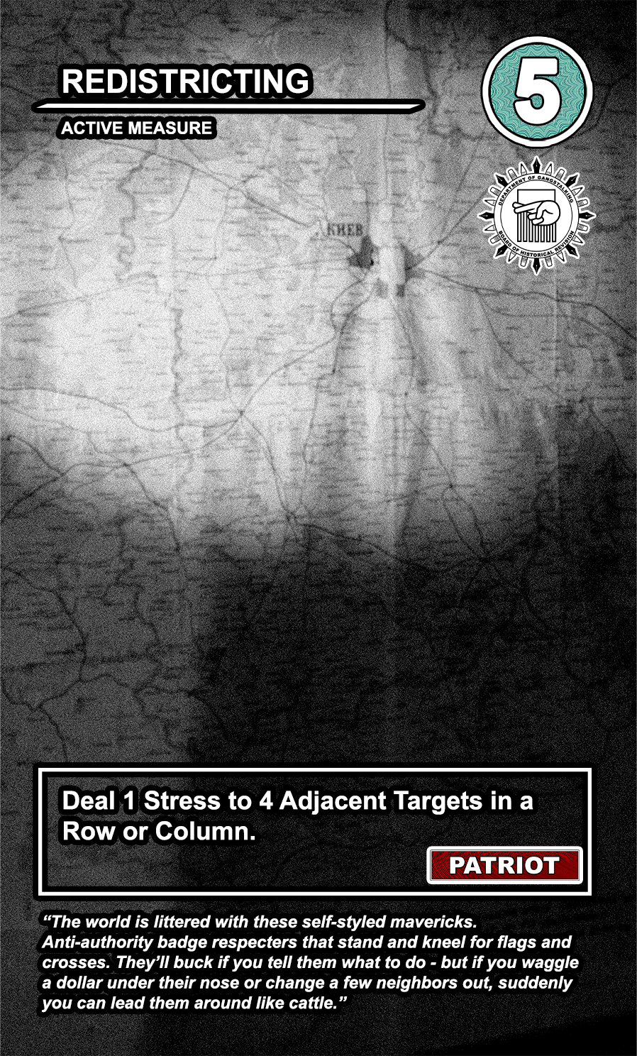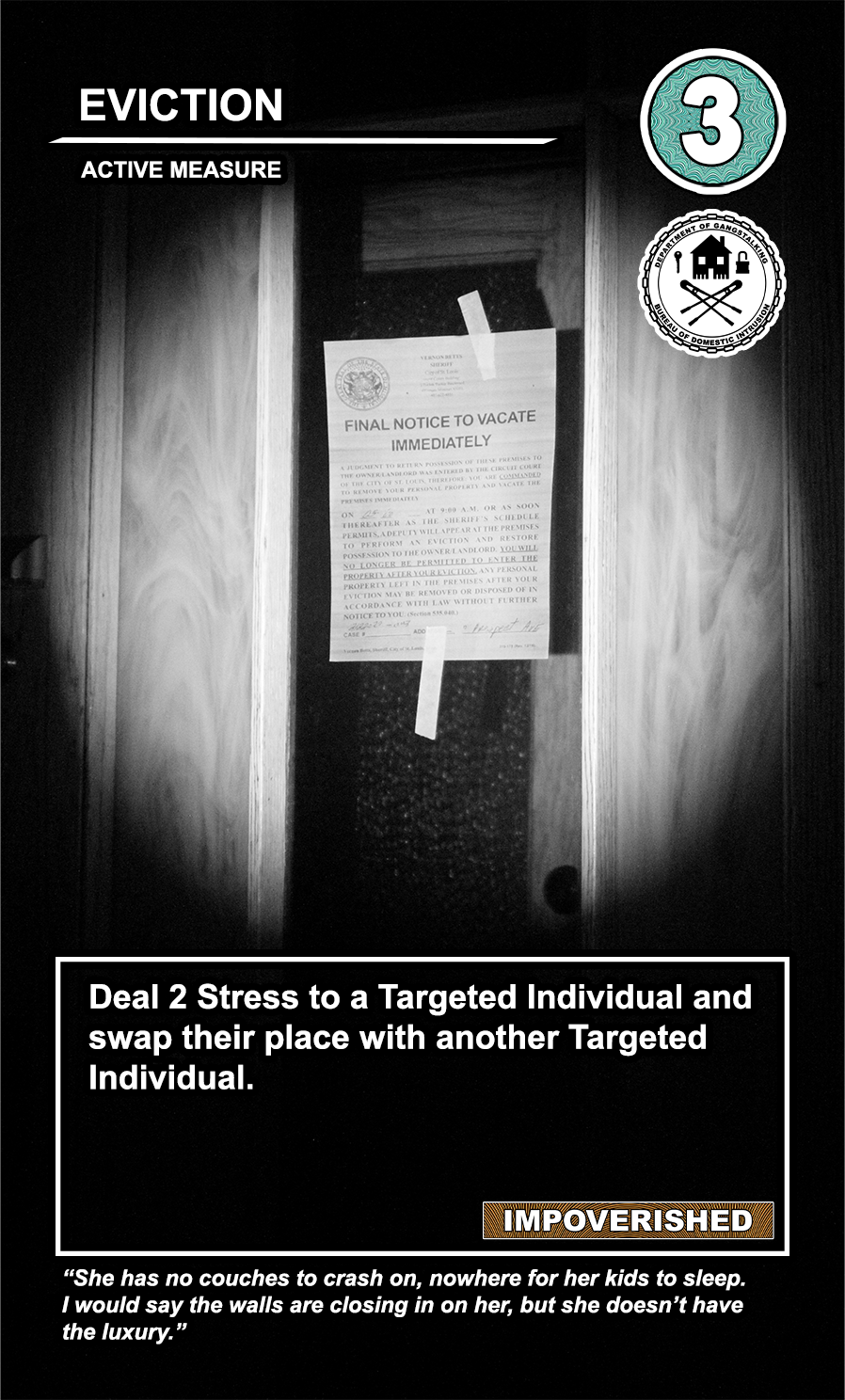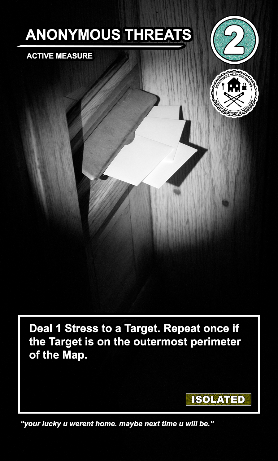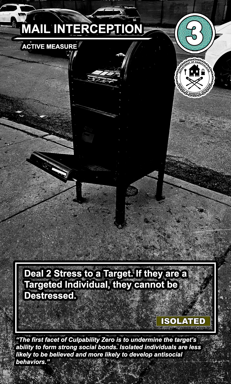 This is a draft of the “Targeted Individual.” These are the Targets that are subjected to harassment by the players of the game. They have traits like Patriot, Delinquent, Religious, Sexual Deviant, Isolated, Traumatized, Drug User, and High Value. They have a Max Stress level in the top right corner: once enough stress has been delt to them, they become Radicalized, causing stress to other Targets around them and rewarding their harasser with resources detailed at the bottom of the card. At the very bottom, they have unique flavor text that gives insight to their place in the story of the game.