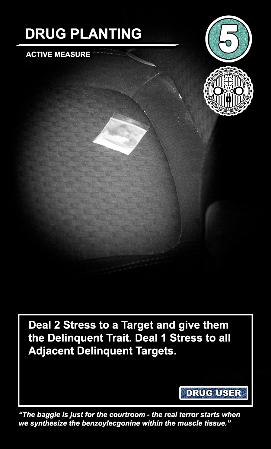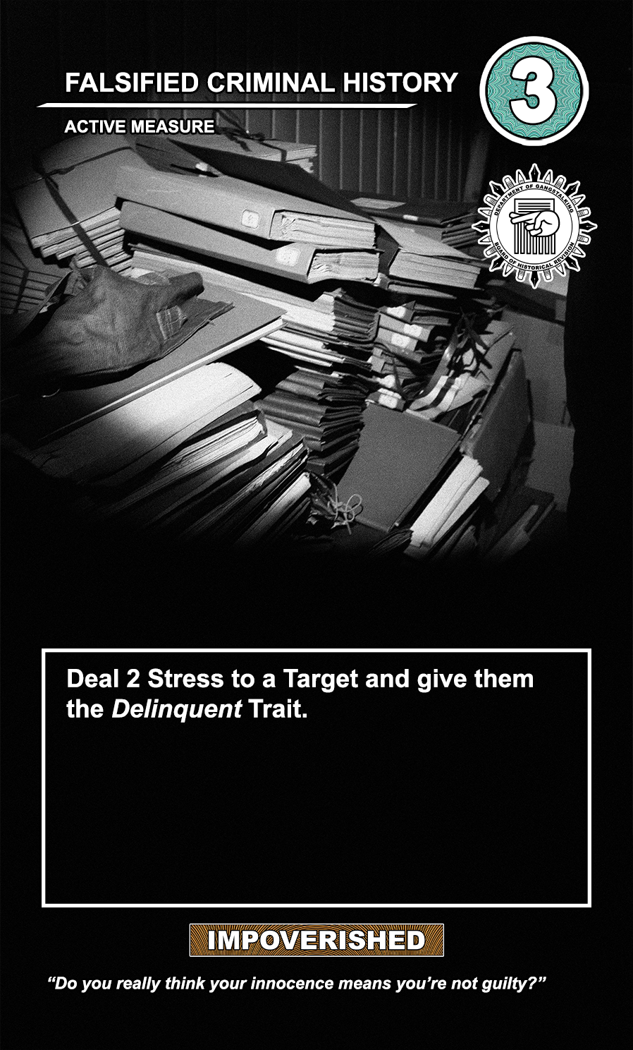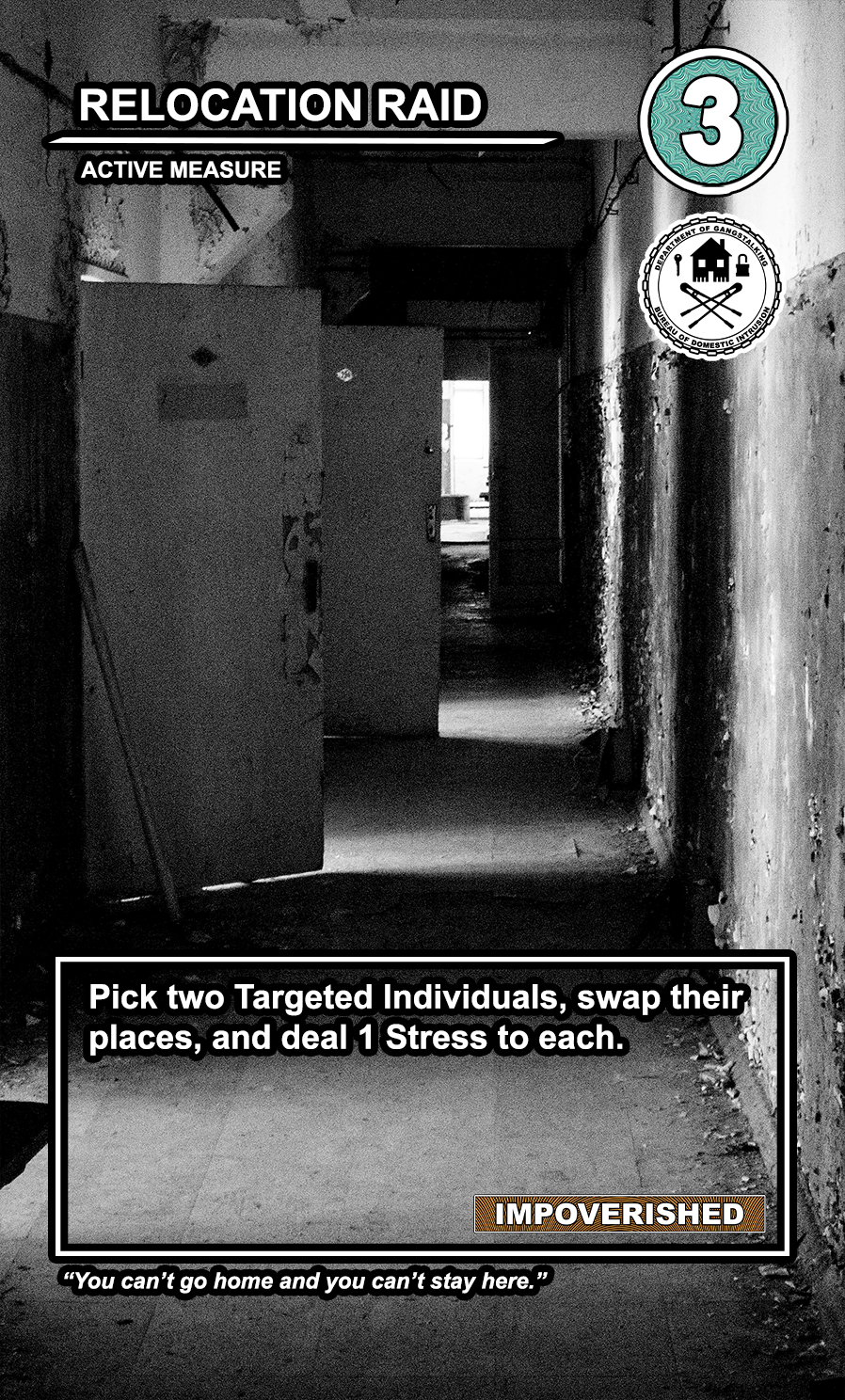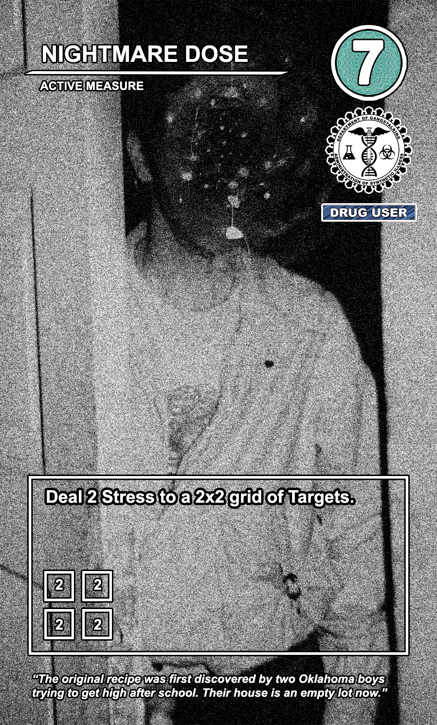 This is a draft of the “Targeted Individual.” These are the Targets that are subjected to harassment by the players of the game. They have traits like Patriot, Delinquent, Religious, Sexual Deviant, Isolated, Traumatized, Drug User, and High Value. They have a Max Stress level in the top right corner: once enough stress has been delt to them, they become Radicalized, causing stress to other Targets around them and rewarding their harasser with resources detailed at the bottom of the card. At the very bottom, they have unique flavor text that gives insight to their place in the story of the game.