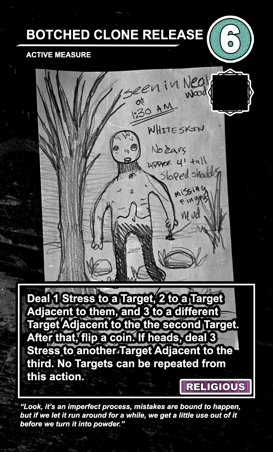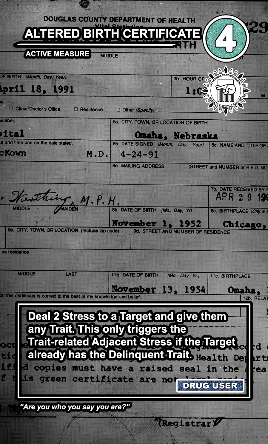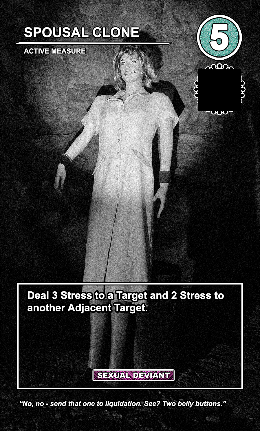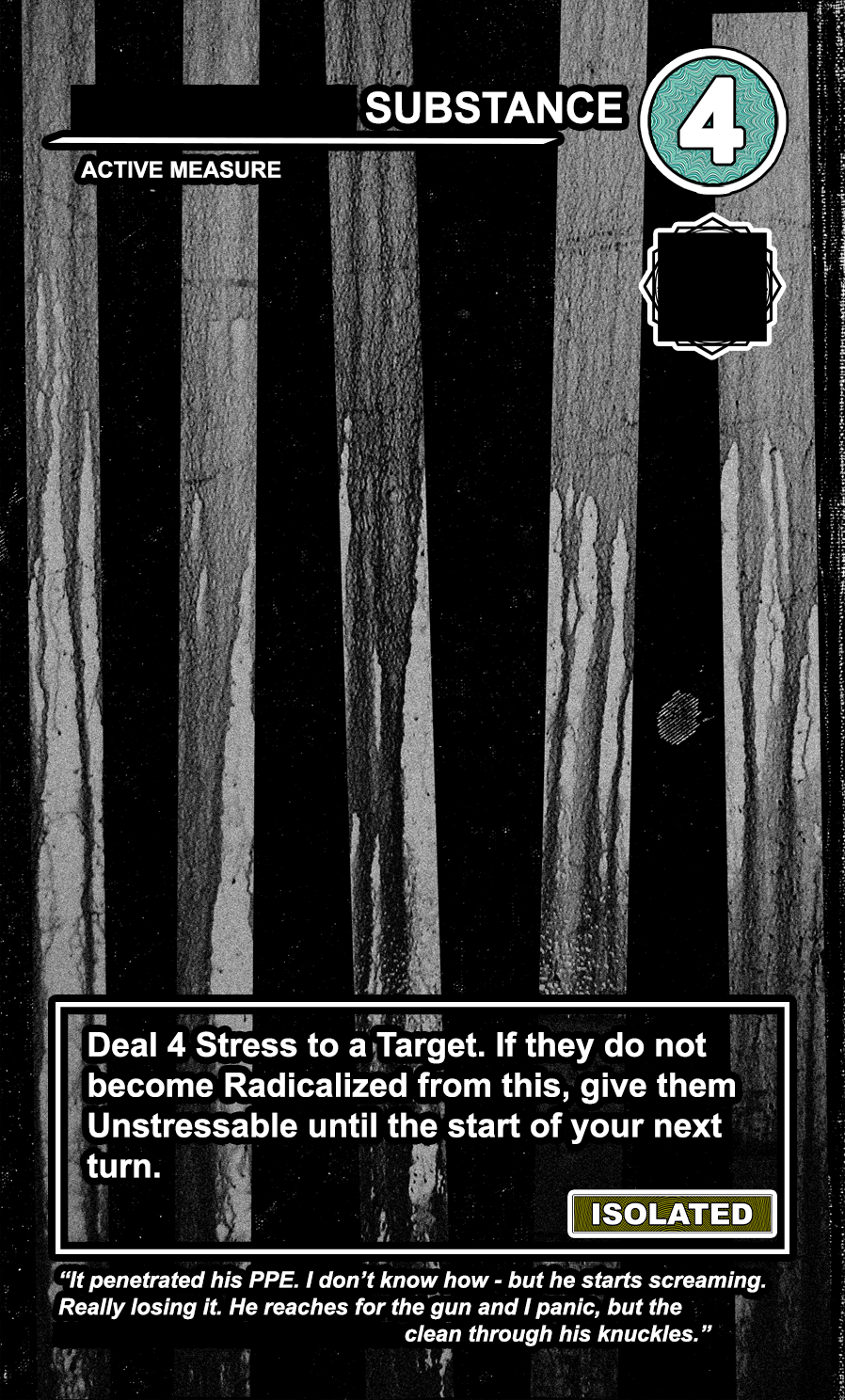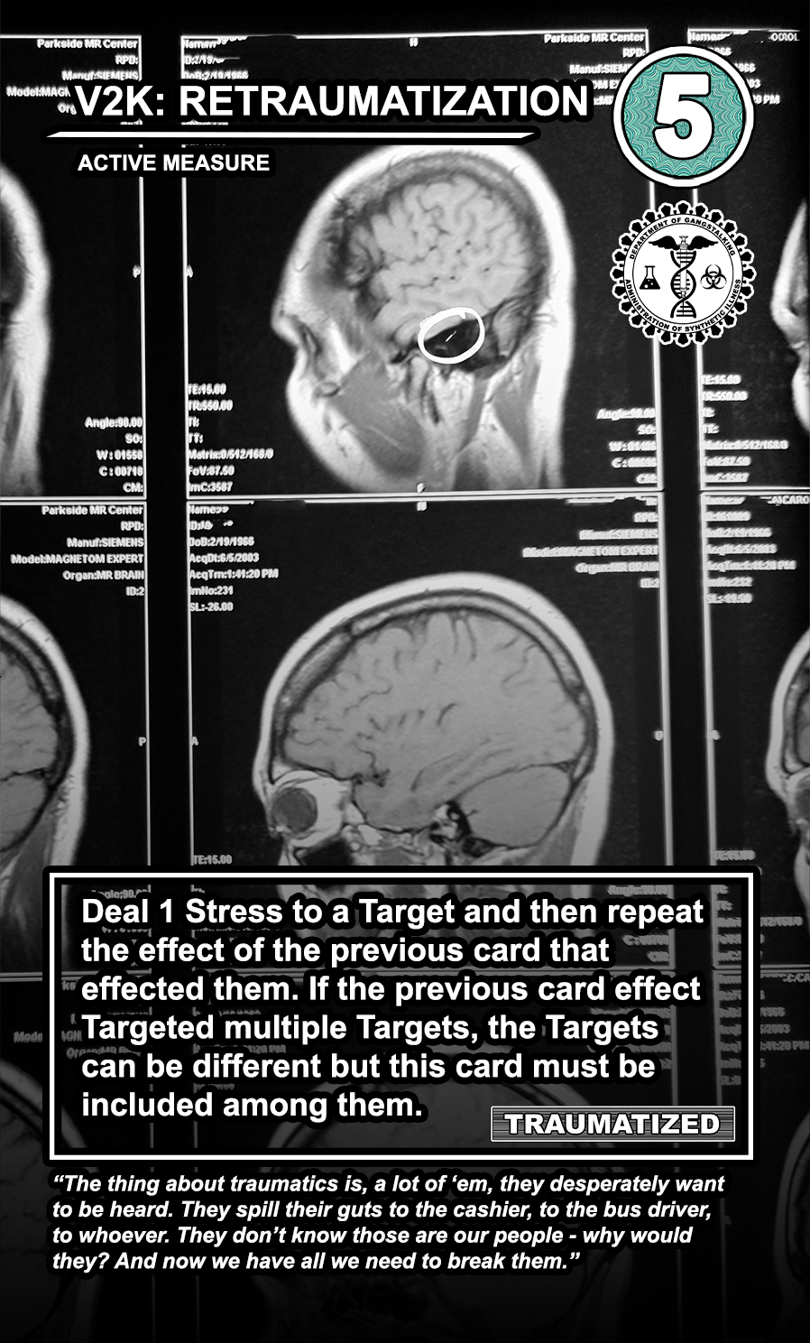 This is a draft of the “Targeted Individual.” These are the Targets that are subjected to harassment by the players of the game. They have traits like Patriot, Delinquent, Religious, Sexual Deviant, Isolated, Traumatized, Drug User, and High Value. They have a Max Stress level in the top right corner: once enough stress has been delt to them, they become Radicalized, causing stress to other Targets around them and rewarding their harasser with resources detailed at the bottom of the card. At the very bottom, they have unique flavor text that gives insight to their place in the story of the game.