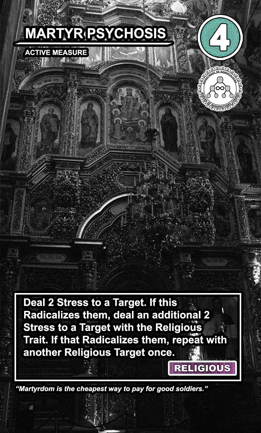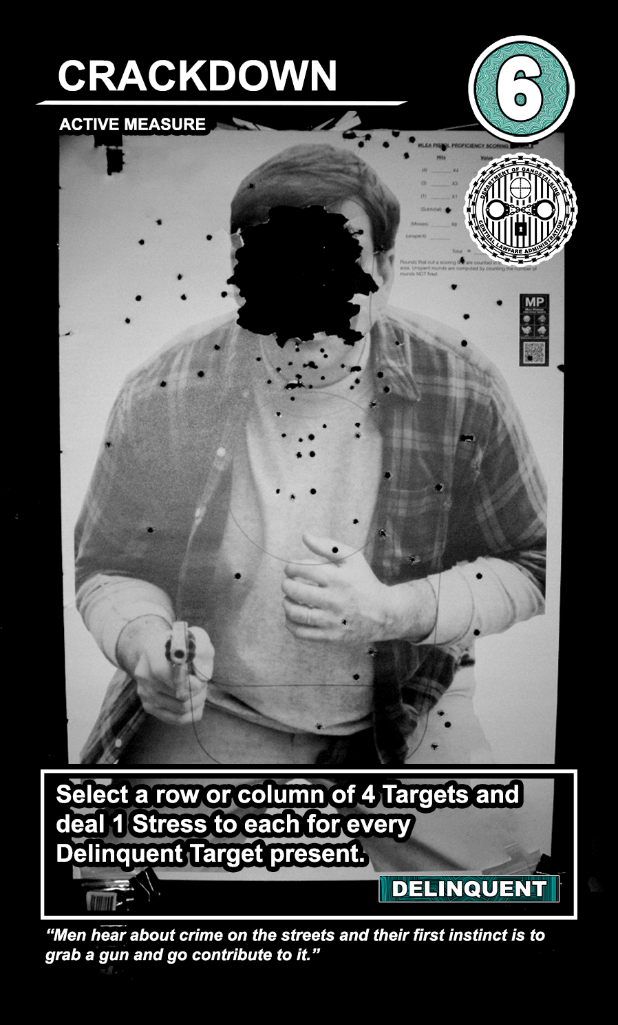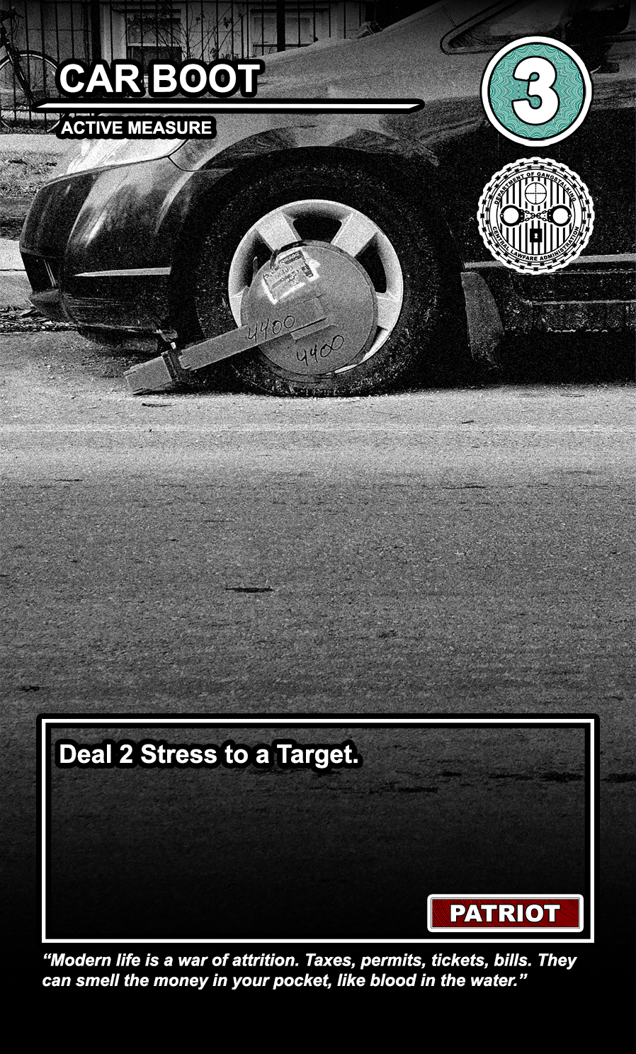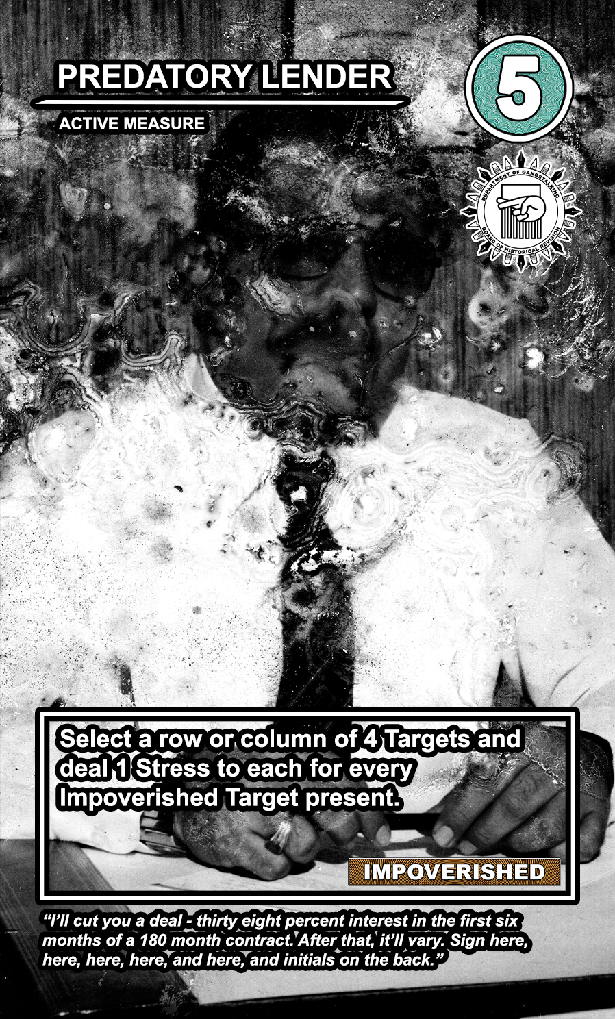 This is a draft of the “Targeted Individual.” These are the Targets that are subjected to harassment by the players of the game. They have traits like Patriot, Delinquent, Religious, Sexual Deviant, Isolated, Traumatized, Drug User, and High Value. They have a Max Stress level in the top right corner: once enough stress has been delt to them, they become Radicalized, causing stress to other Targets around them and rewarding their harasser with resources detailed at the bottom of the card. At the very bottom, they have unique flavor text that gives insight to their place in the story of the game.