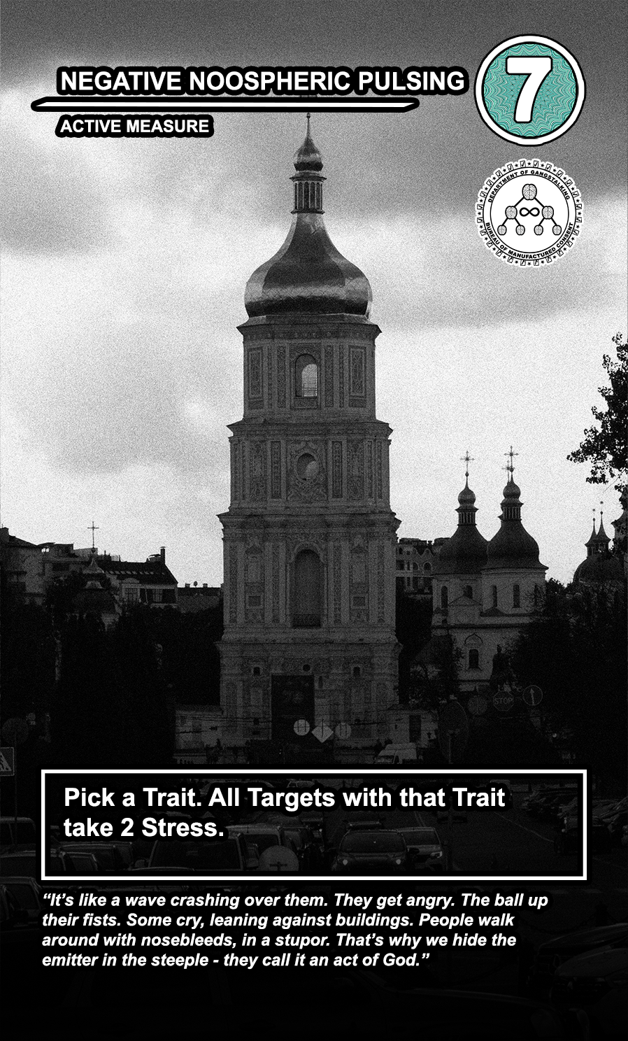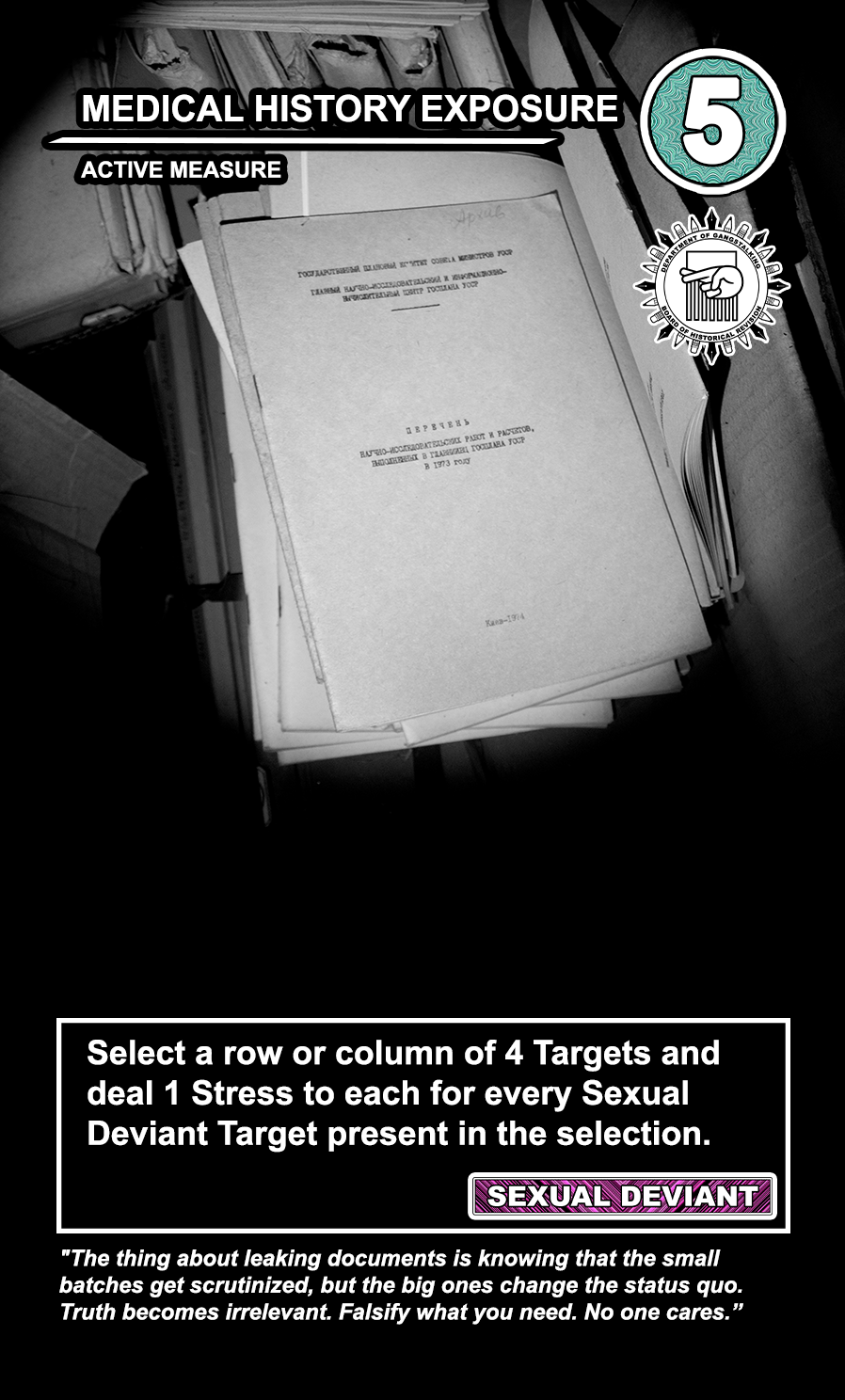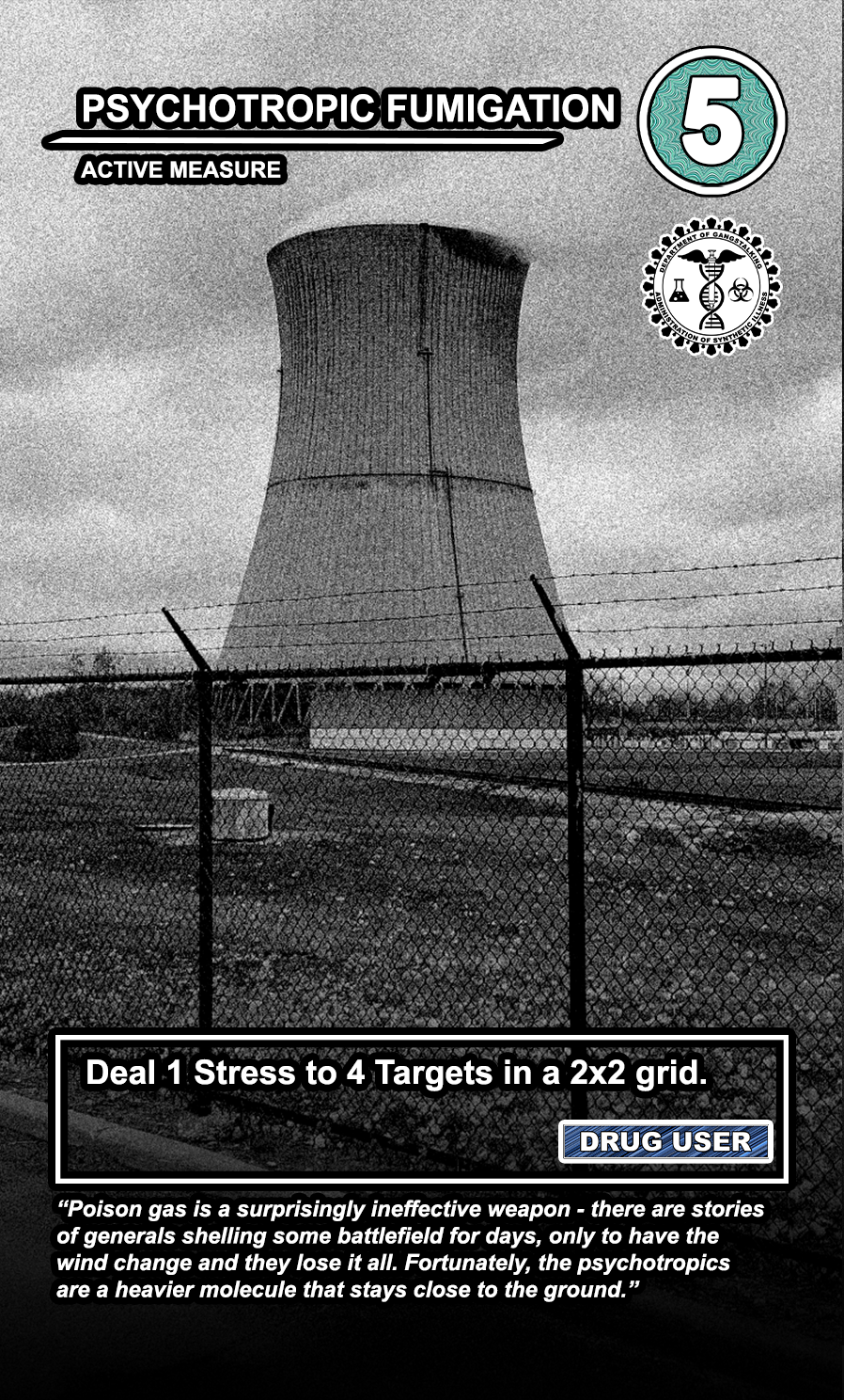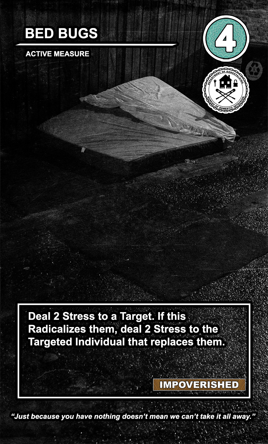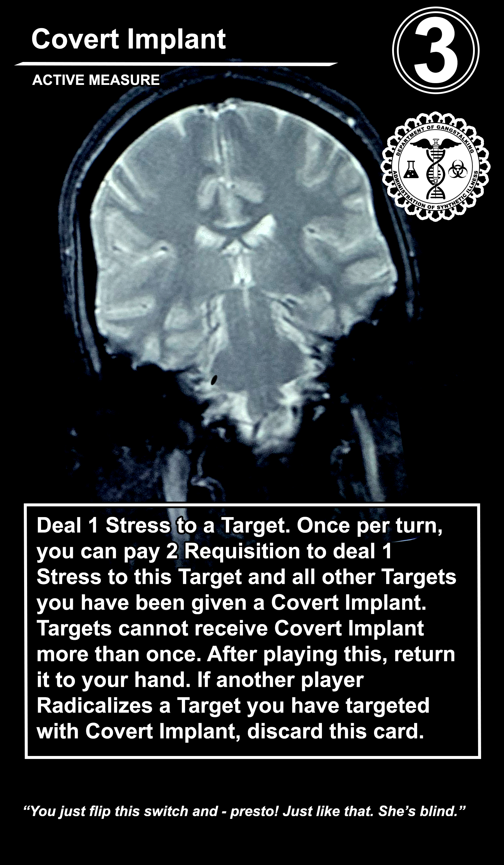 These care contribute directly to causing stress to Targeted Individuals and, eventually, other players. Their Requisition cost is listed in the top corner. Below that, the subdepartment to which they belong. Varying NEWS cards (still being developed) will confer discounts and bonuses for cards within particular departments. Note that certain ACTIVE MEASURE cards are effective against certain types of Individuals, which causes the Target to receive more stress and to cause more stress to those around them.