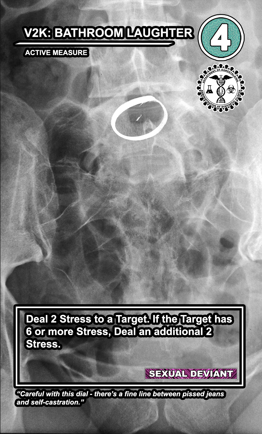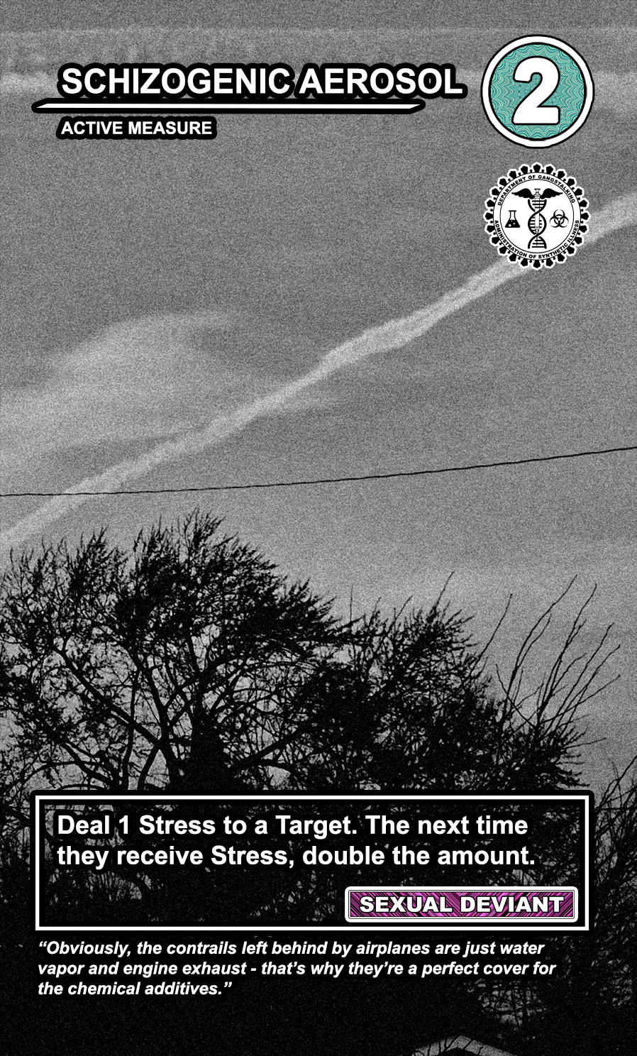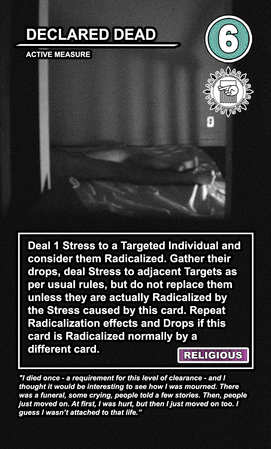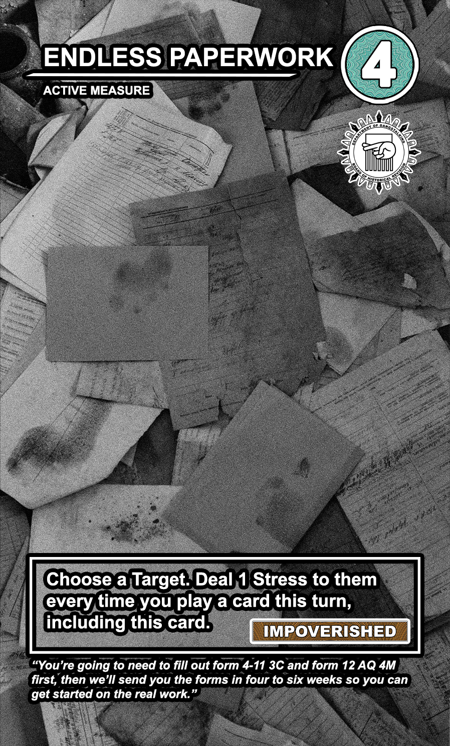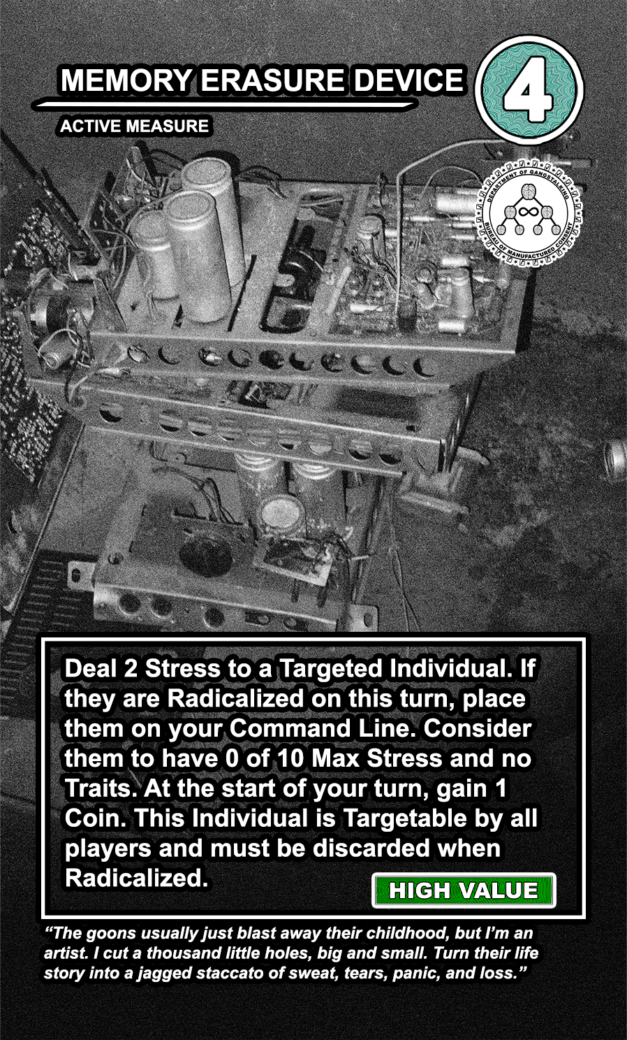 These care contribute directly to causing stress to Targeted Individuals and, eventually, other players. Their Requisition cost is listed in the top corner. Below that, the subdepartment to which they belong. Varying NEWS cards (still being developed) will confer discounts and bonuses for cards within particular departments. Note that certain ACTIVE MEASURE cards are effective against certain types of Individuals, which causes the Target to receive more stress and to cause more stress to those around them.