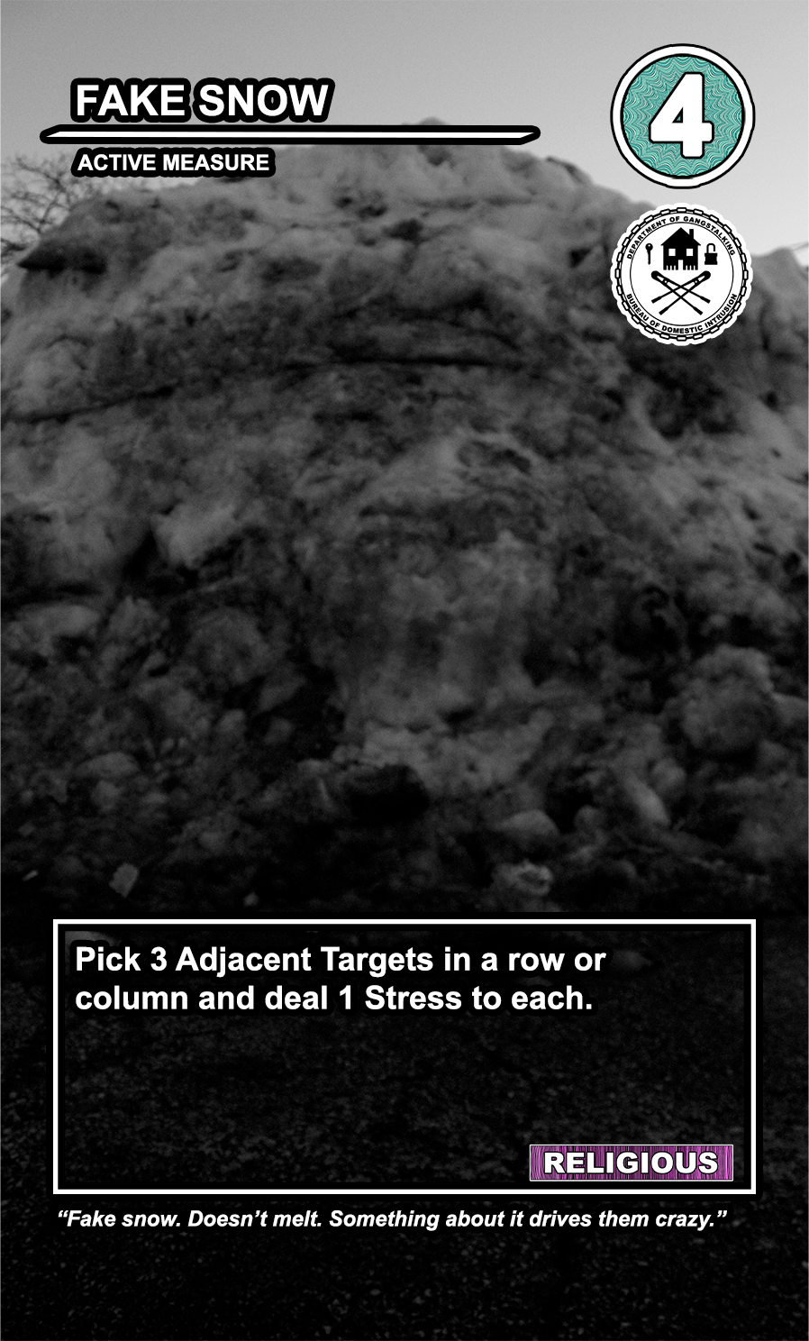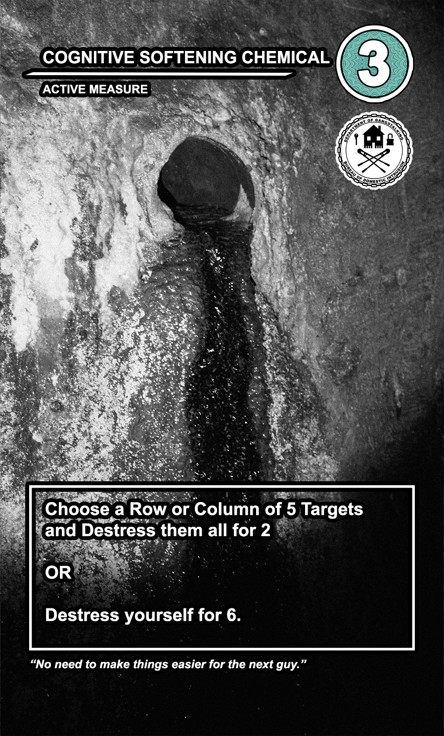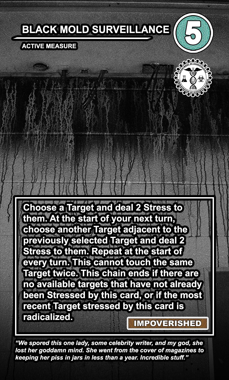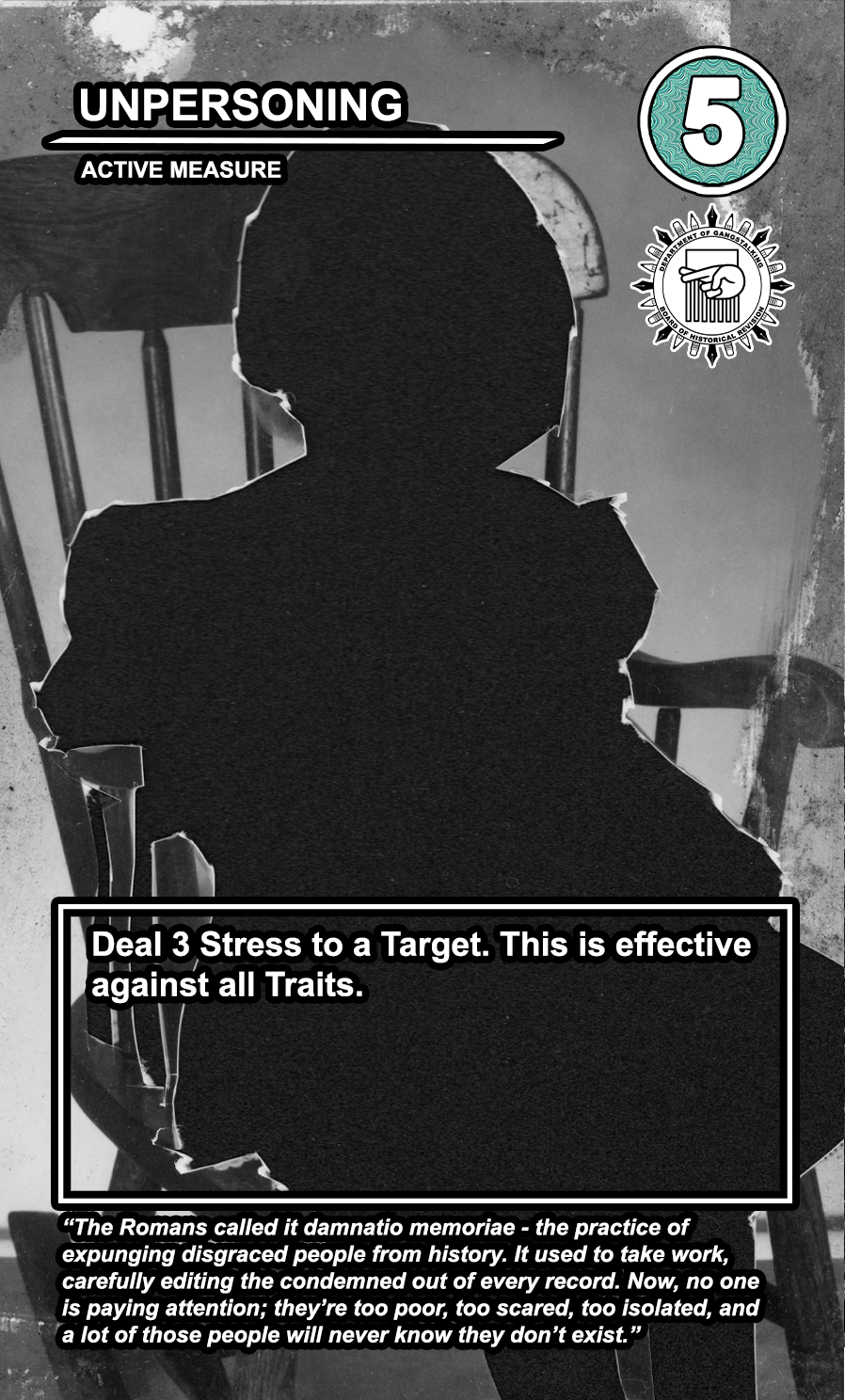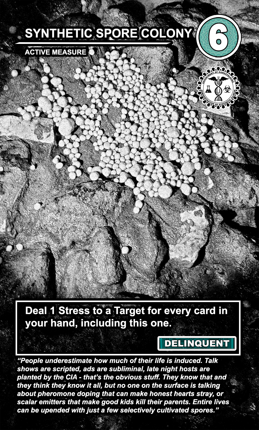 These care contribute directly to causing stress to Targeted Individuals and, eventually, other players. Their Requisition cost is listed in the top corner. Below that, the subdepartment to which they belong. Varying NEWS cards (still being developed) will confer discounts and bonuses for cards within particular departments. Note that certain ACTIVE MEASURE cards are effective against certain types of Individuals, which causes the Target to receive more stress and to cause more stress to those around them.