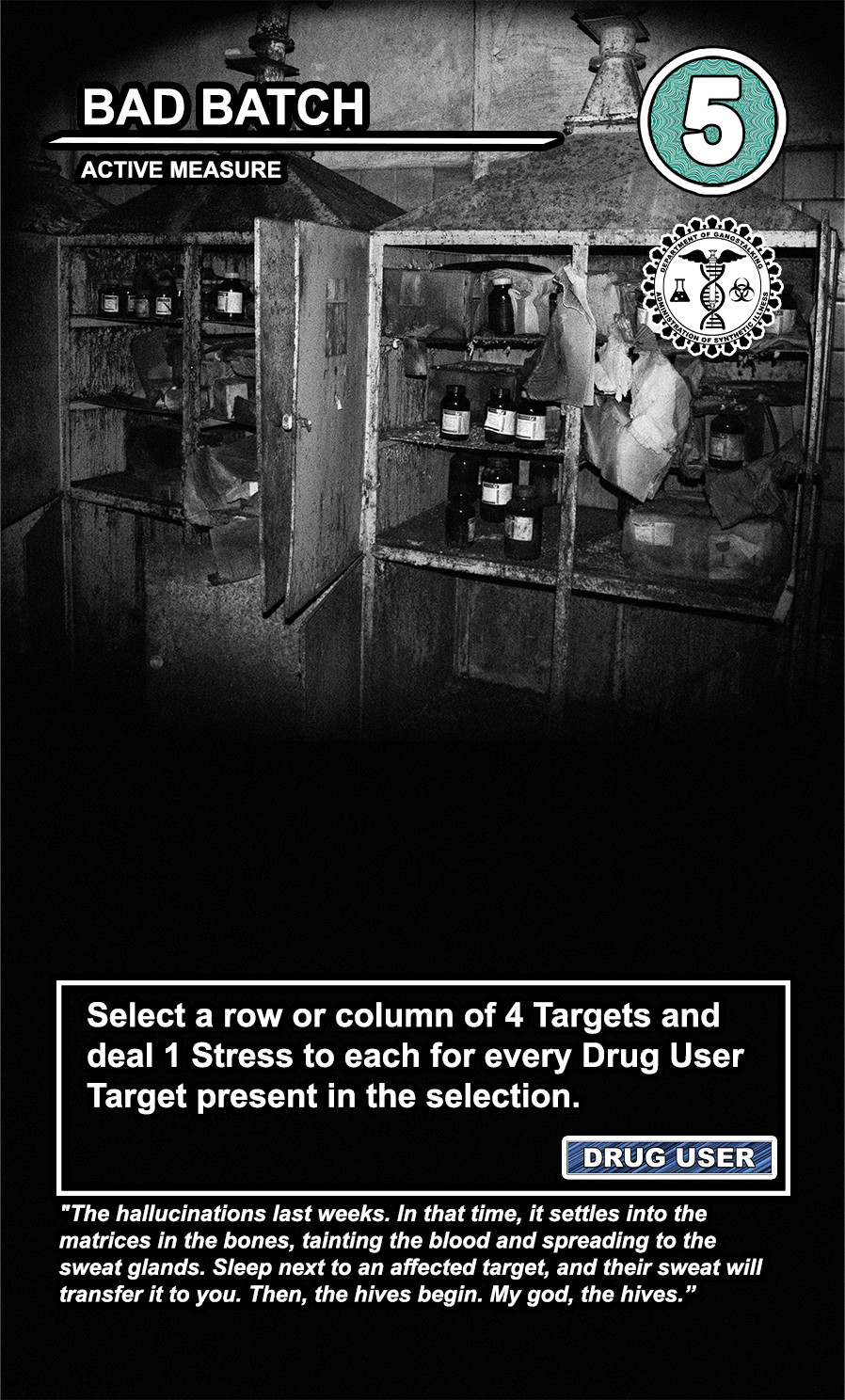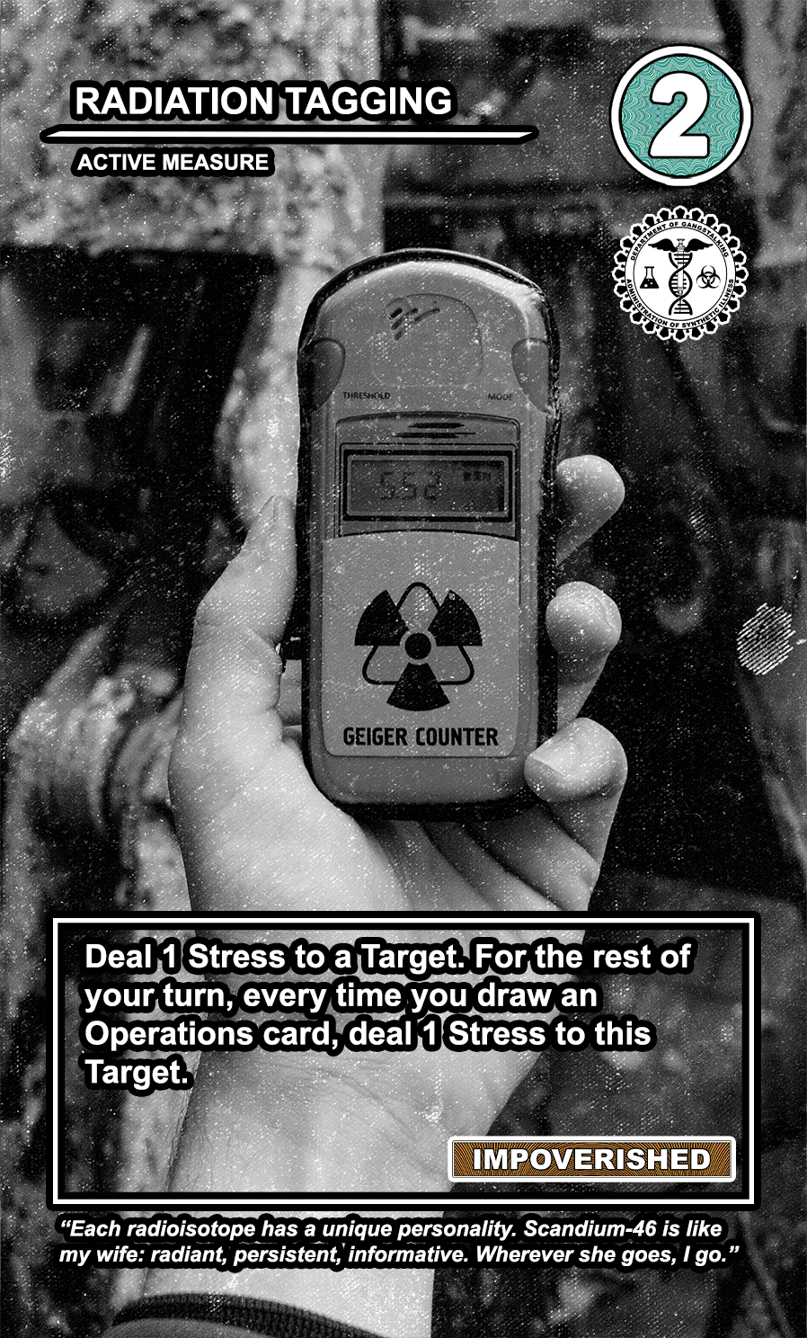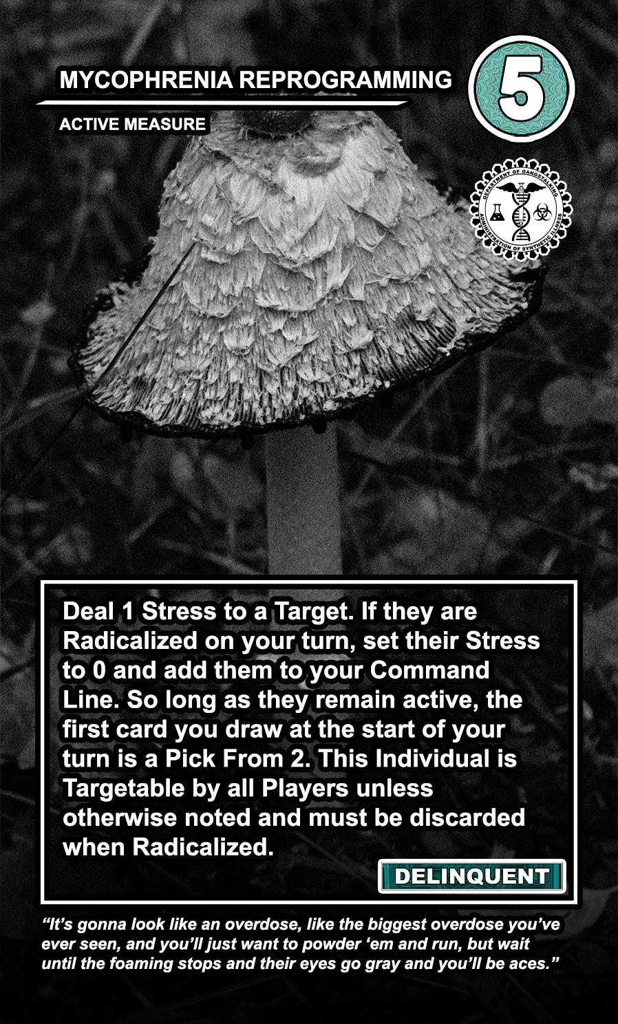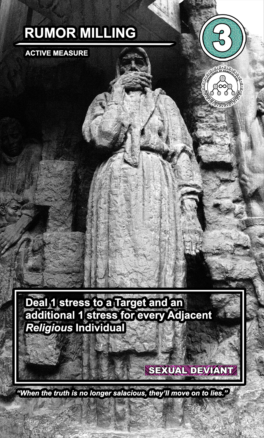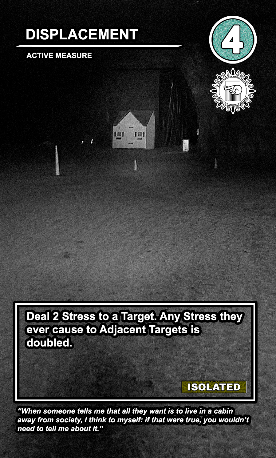 These care contribute directly to causing stress to Targeted Individuals and, eventually, other players. Their Requisition cost is listed in the top corner. Below that, the subdepartment to which they belong. Varying NEWS cards (still being developed) will confer discounts and bonuses for cards within particular departments. Note that certain ACTIVE MEASURE cards are effective against certain types of Individuals, which causes the Target to receive more stress and to cause more stress to those around them.