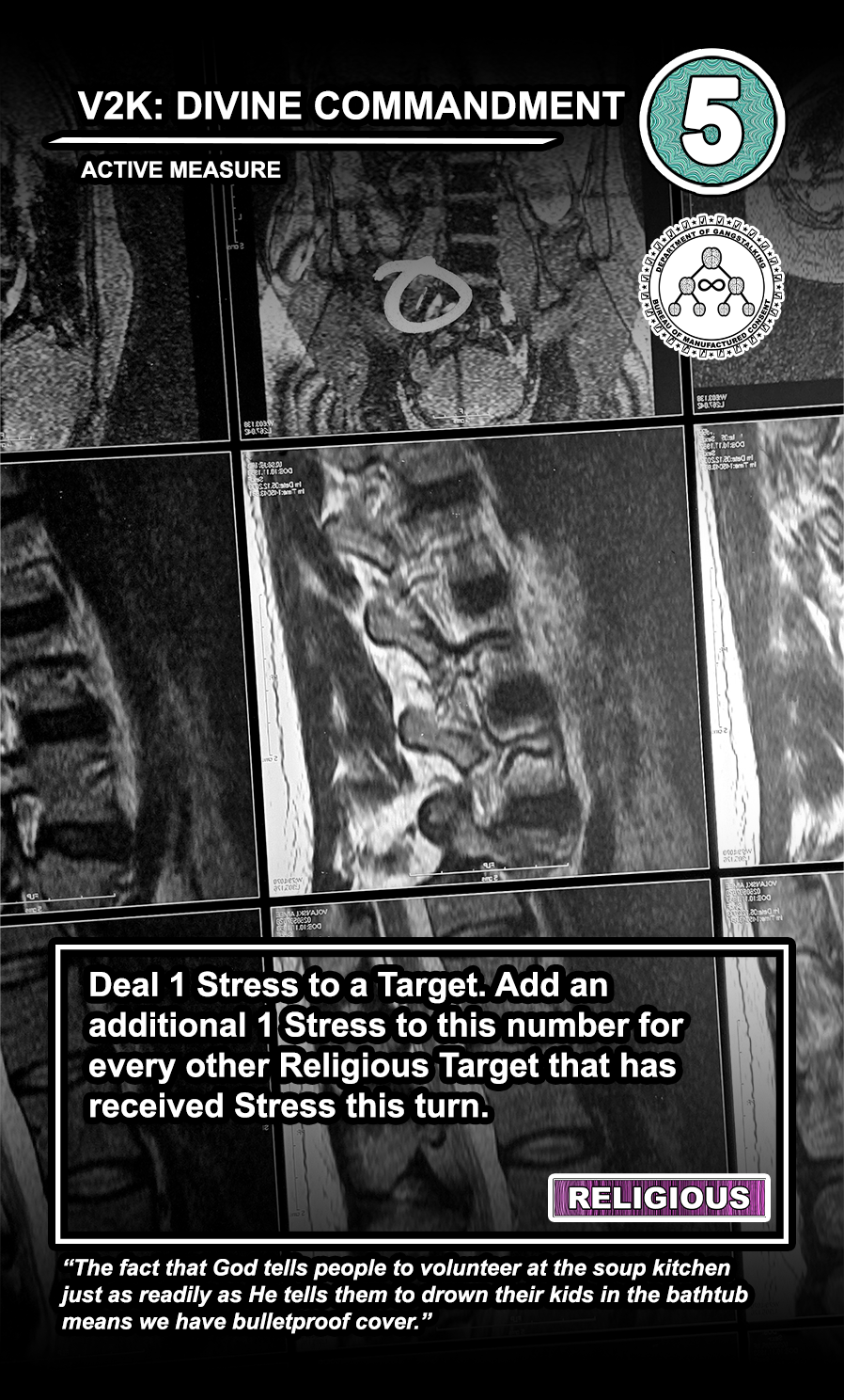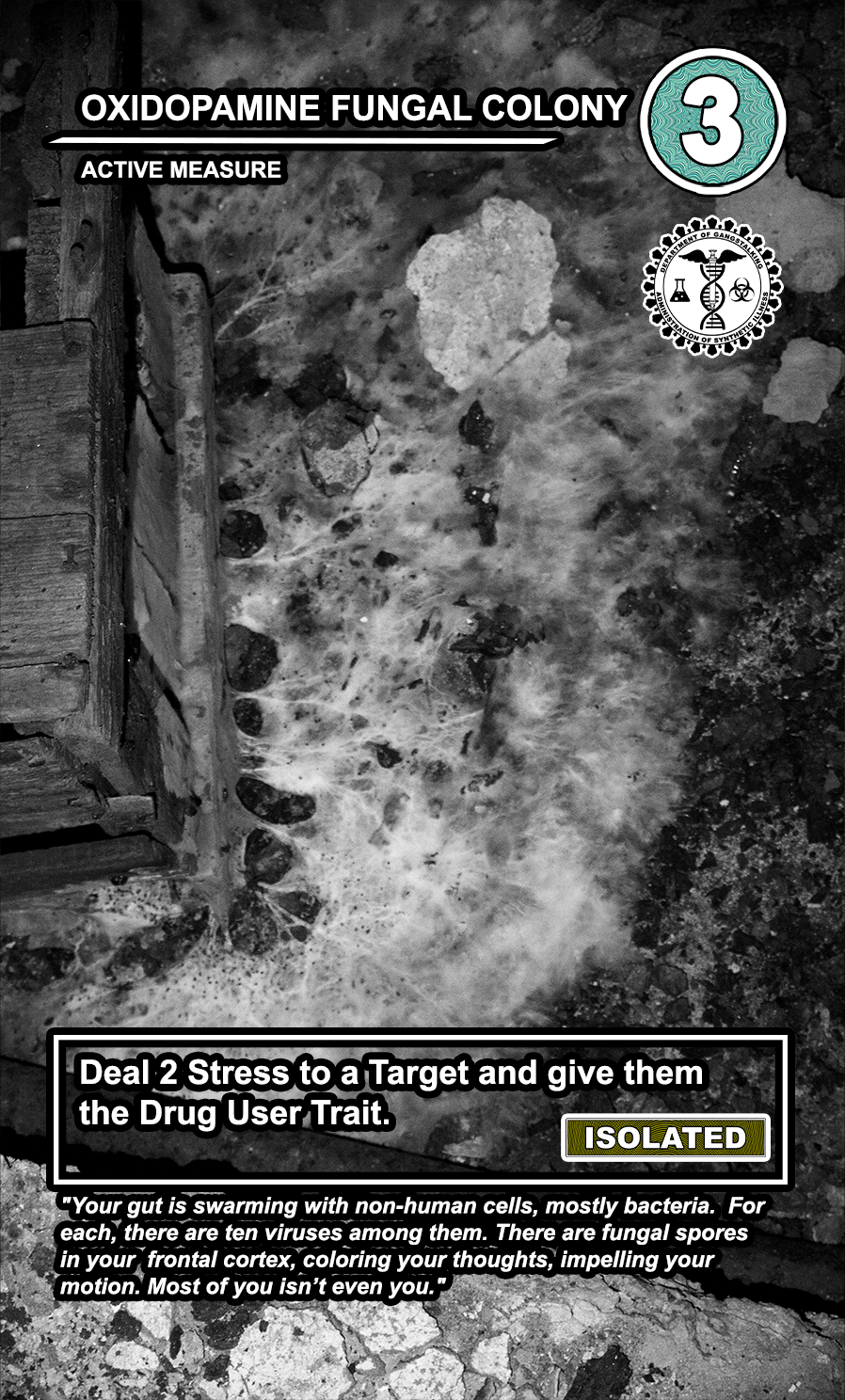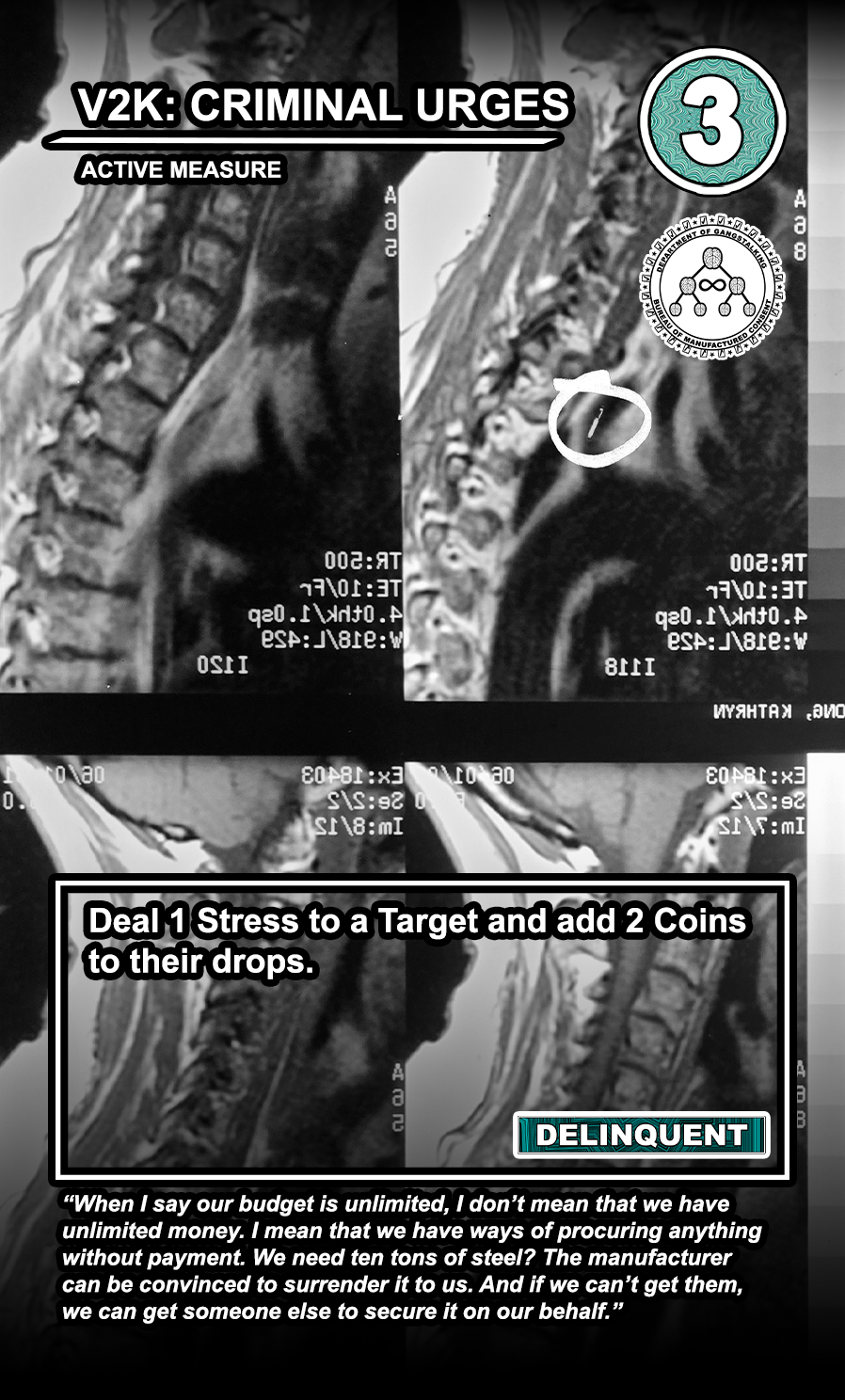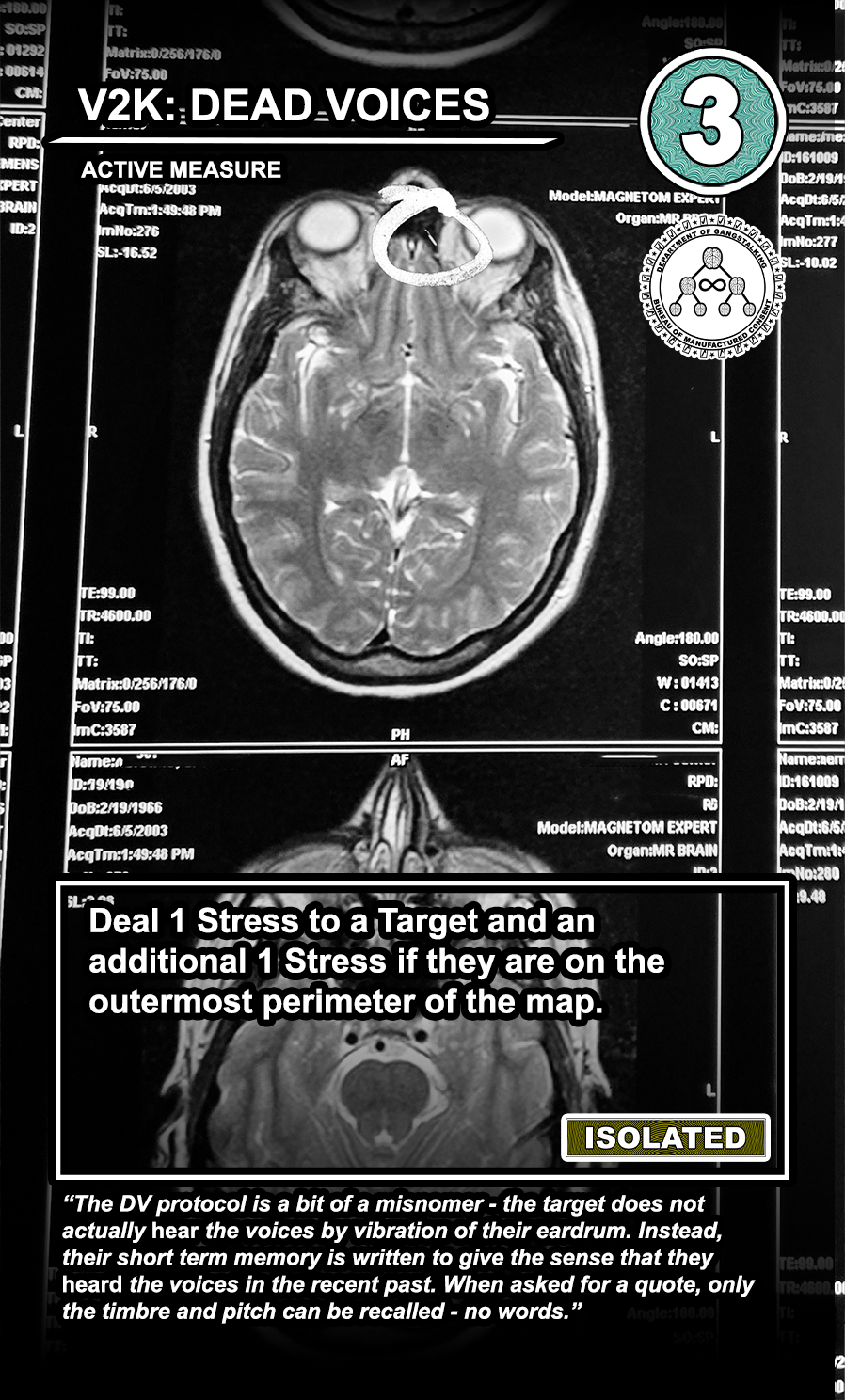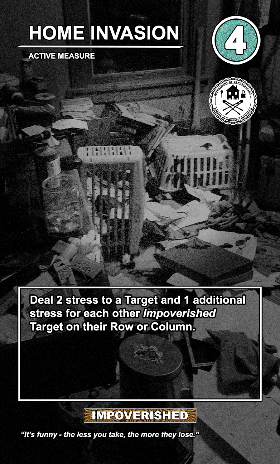 These care contribute directly to causing stress to Targeted Individuals and, eventually, other players. Their Requisition cost is listed in the top corner. Below that, the subdepartment to which they belong. Varying NEWS cards (still being developed) will confer discounts and bonuses for cards within particular departments. Note that certain ACTIVE MEASURE cards are effective against certain types of Individuals, which causes the Target to receive more stress and to cause more stress to those around them.