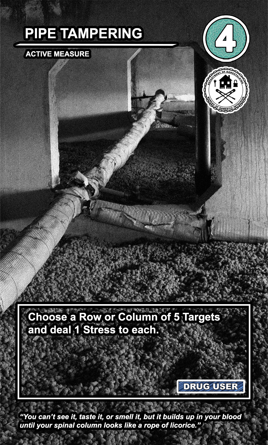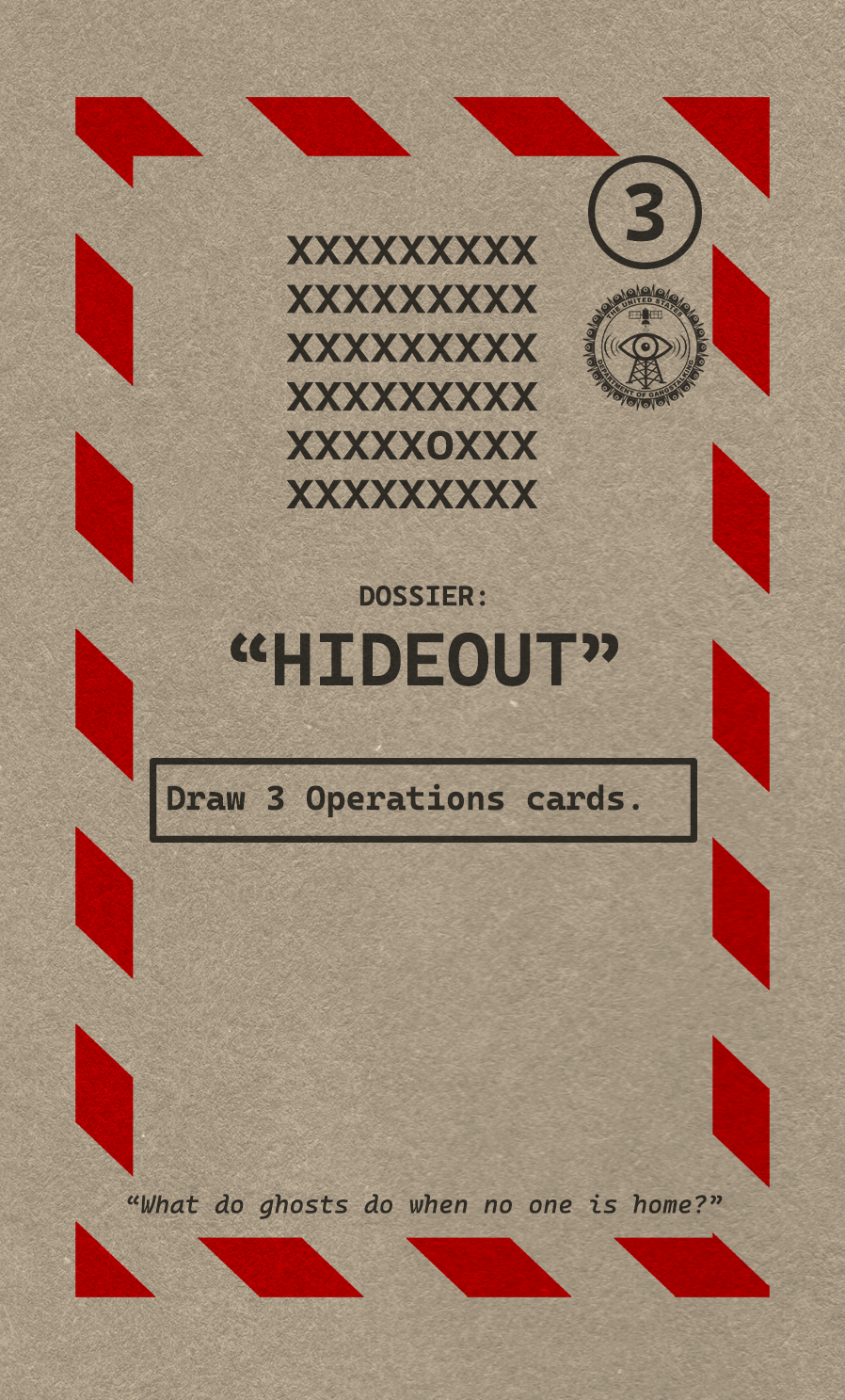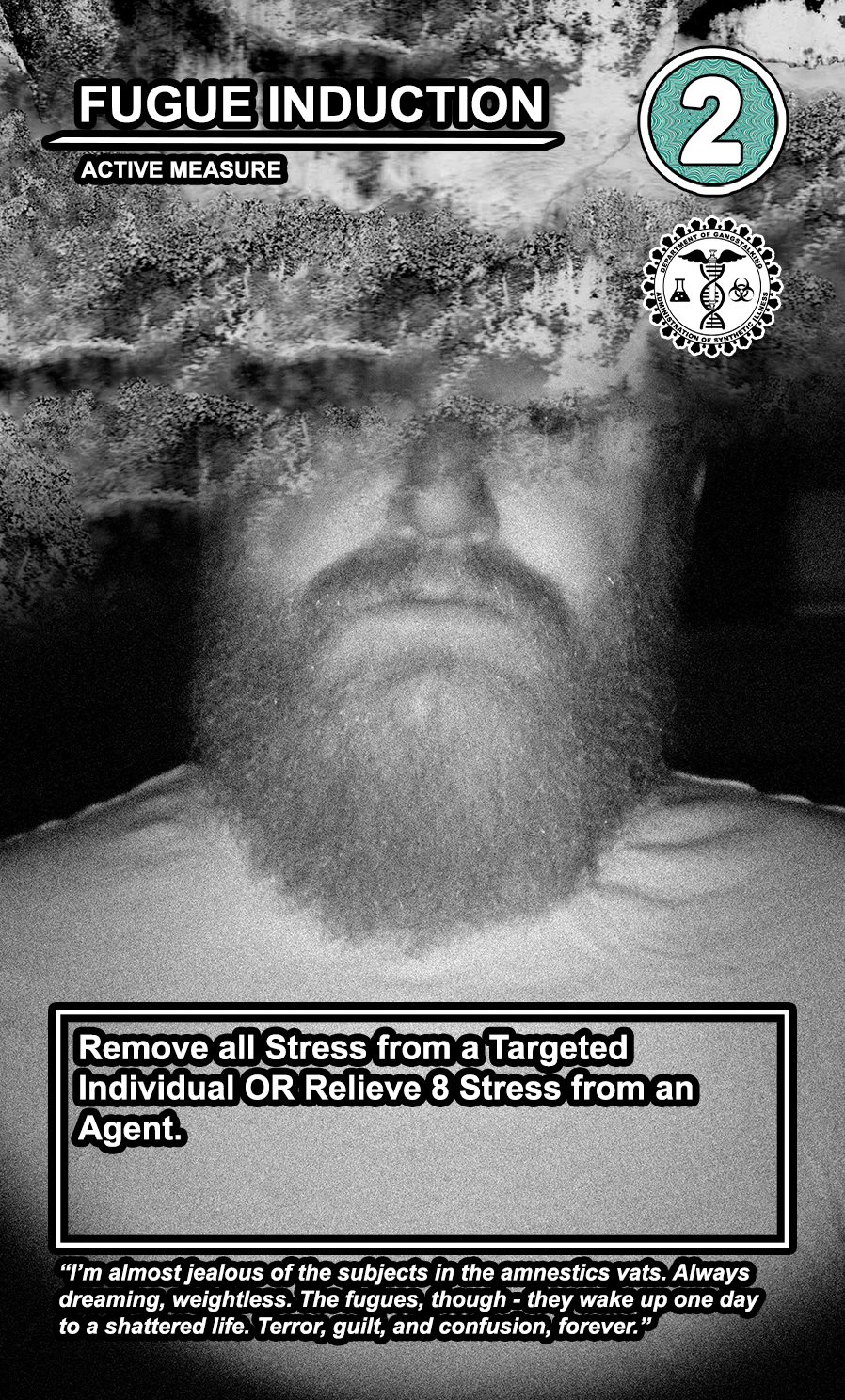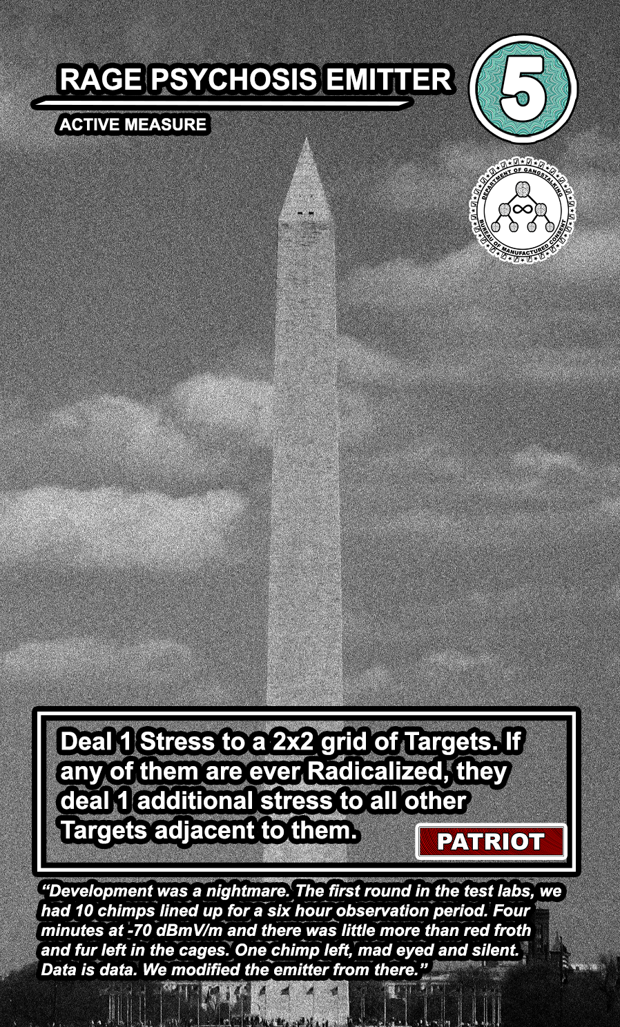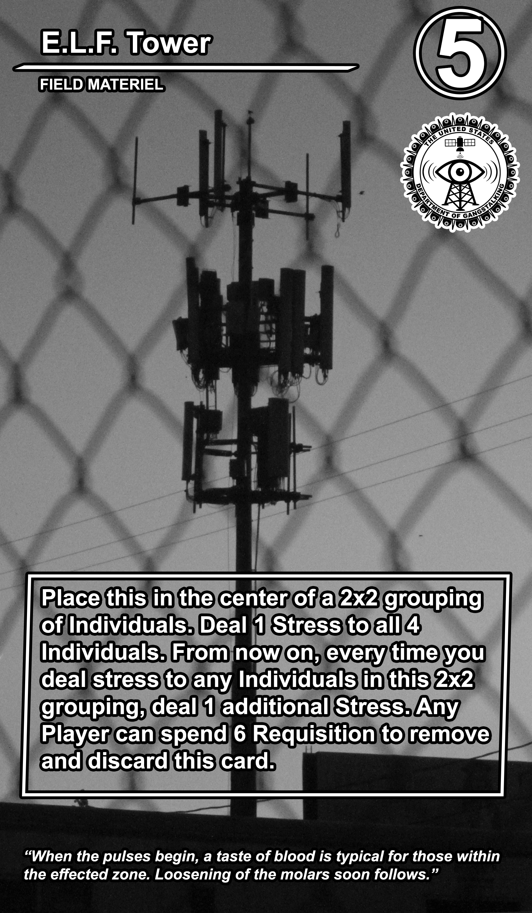 The United States Department of Gangstalking is a game about disinformation, harassment, paranoia, and the collapse of civil society. The game is for 2-4 players who take on the roles of Agents of Gross Cognitive Harm, with the goal of harassing a grid of Targeted Individuals until they become Radicalized. They do this by using Operations cards, which detail various harassment tactics, like covert implants, drugs, mind control, and other forms of manipulation that cause stress to the Targets. When Individuals reach Max Stress, they become Radicalized and cause stress to other Individuals around them, produce rewards for the player that radicalized them, and are removed and replaced with another Targeted Individual. Some Individuals are High Value Targets, like Radio DJs, celebrities, and politicians, and they produce greater rewards and cause more stress when they are Radicalized.