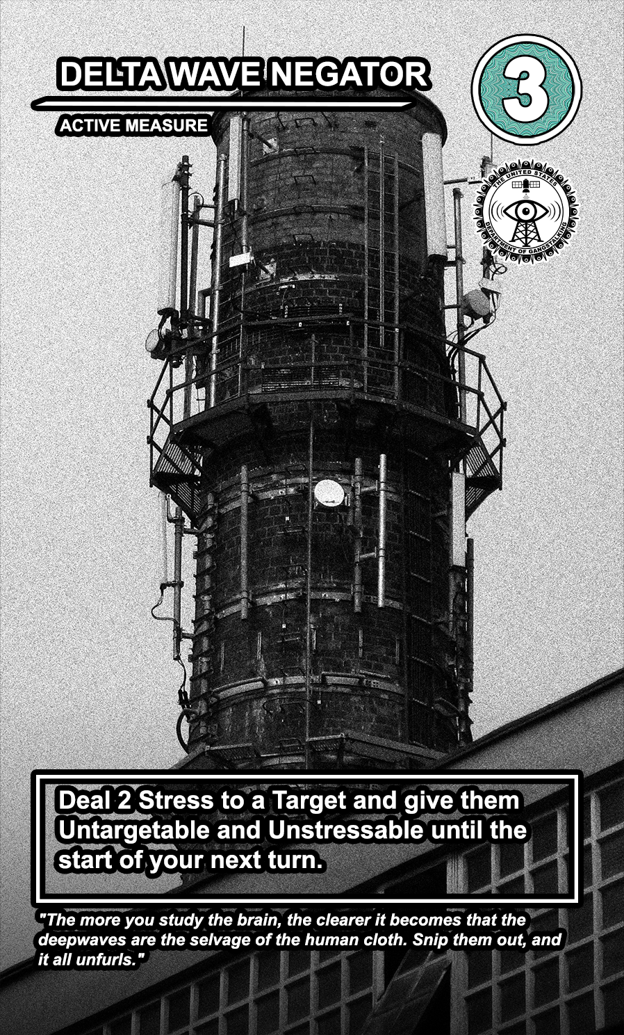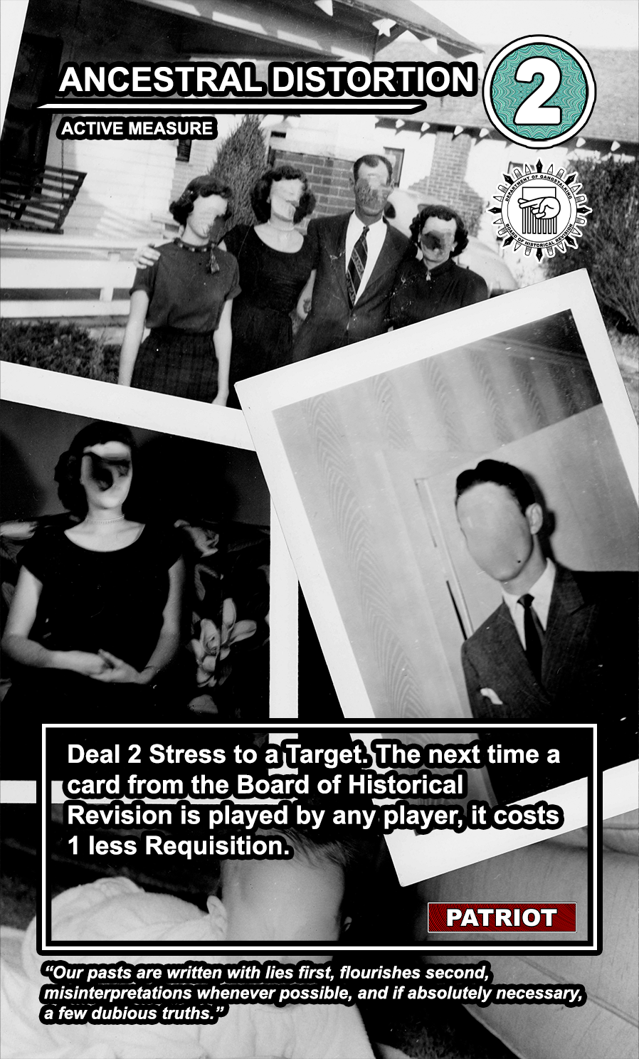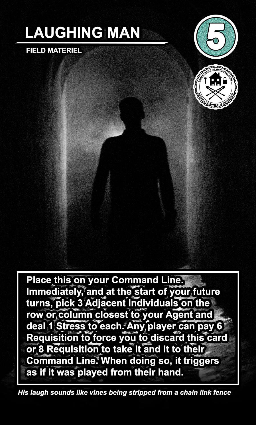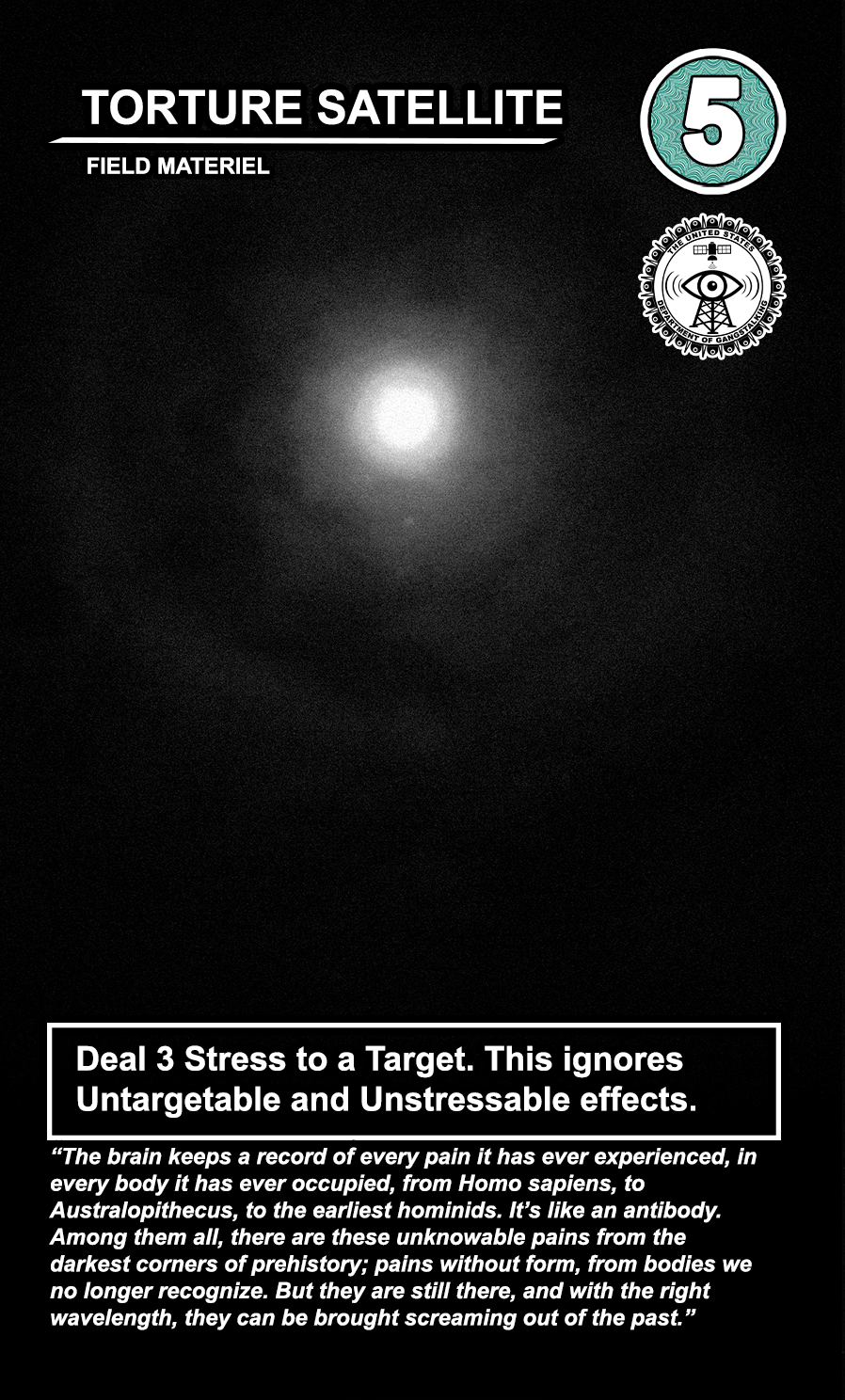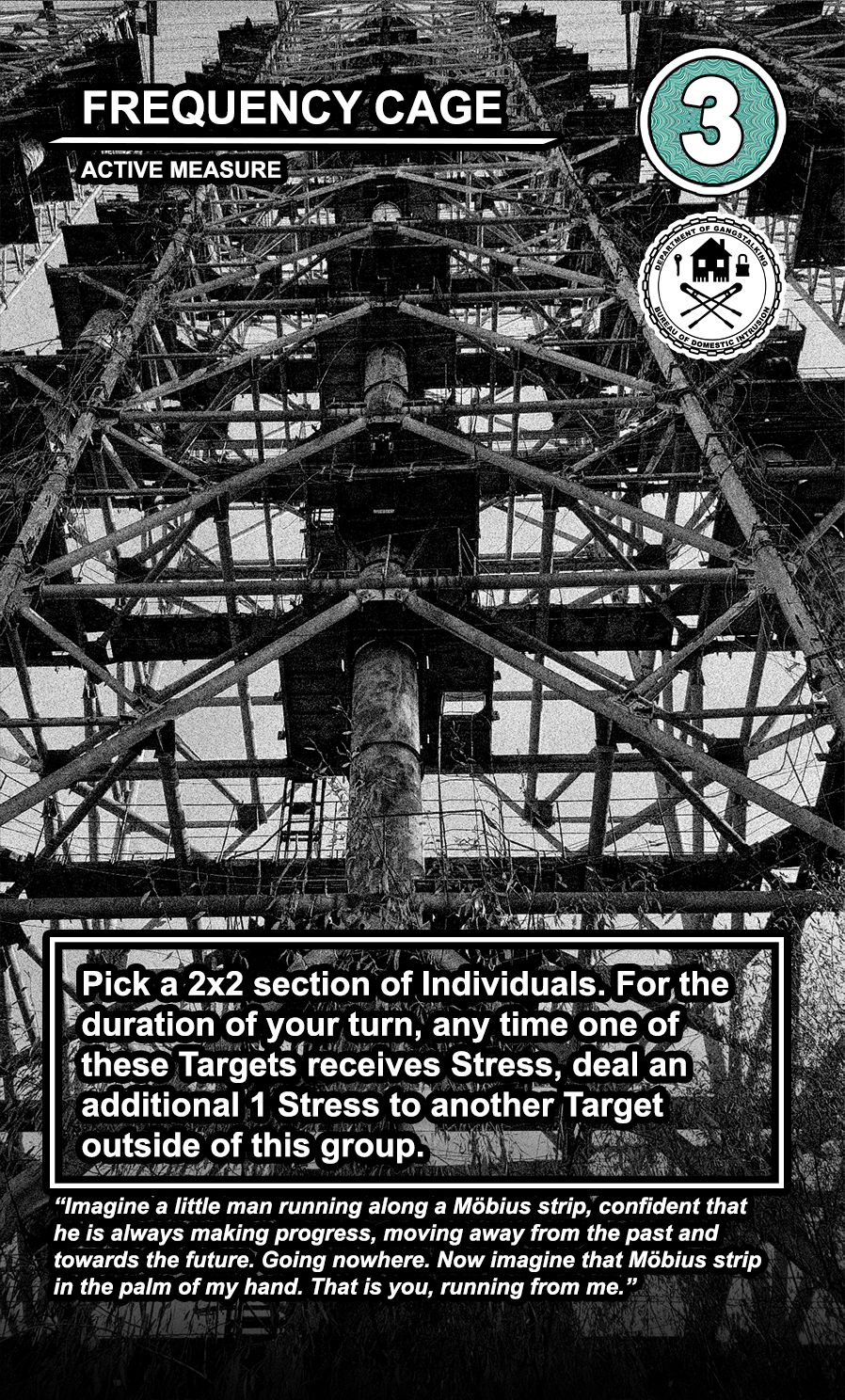 The United States Department of Gangstalking is a game about disinformation, harassment, paranoia, and the collapse of civil society. The game is for 2-4 players who take on the roles of Agents of Gross Cognitive Harm, with the goal of harassing a grid of Targeted Individuals until they become Radicalized. They do this by using Operations cards, which detail various harassment tactics, like covert implants, drugs, mind control, and other forms of manipulation that cause stress to the Targets. When Individuals reach Max Stress, they become Radicalized and cause stress to other Individuals around them, produce rewards for the player that radicalized them, and are removed and replaced with another Targeted Individual. Some Individuals are High Value Targets, like Radio DJs, celebrities, and politicians, and they produce greater rewards and cause more stress when they are Radicalized.