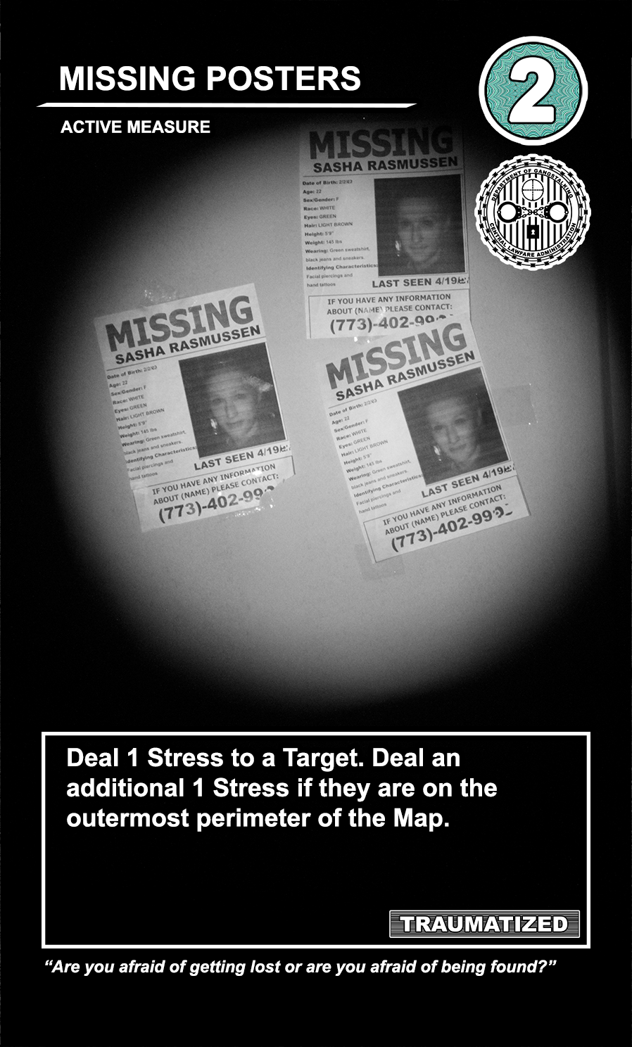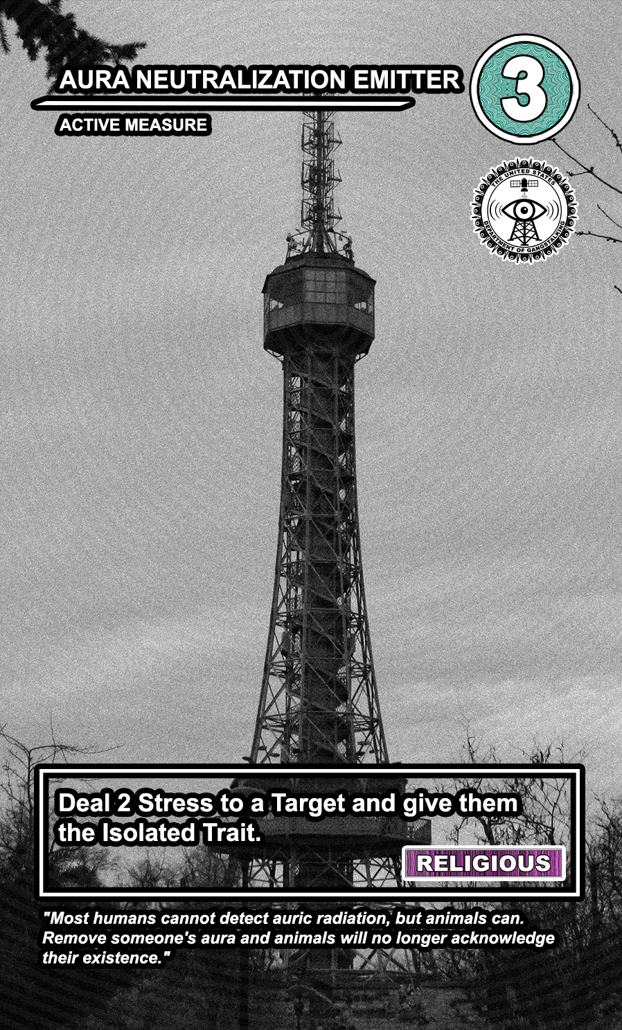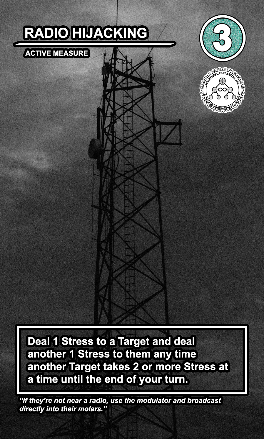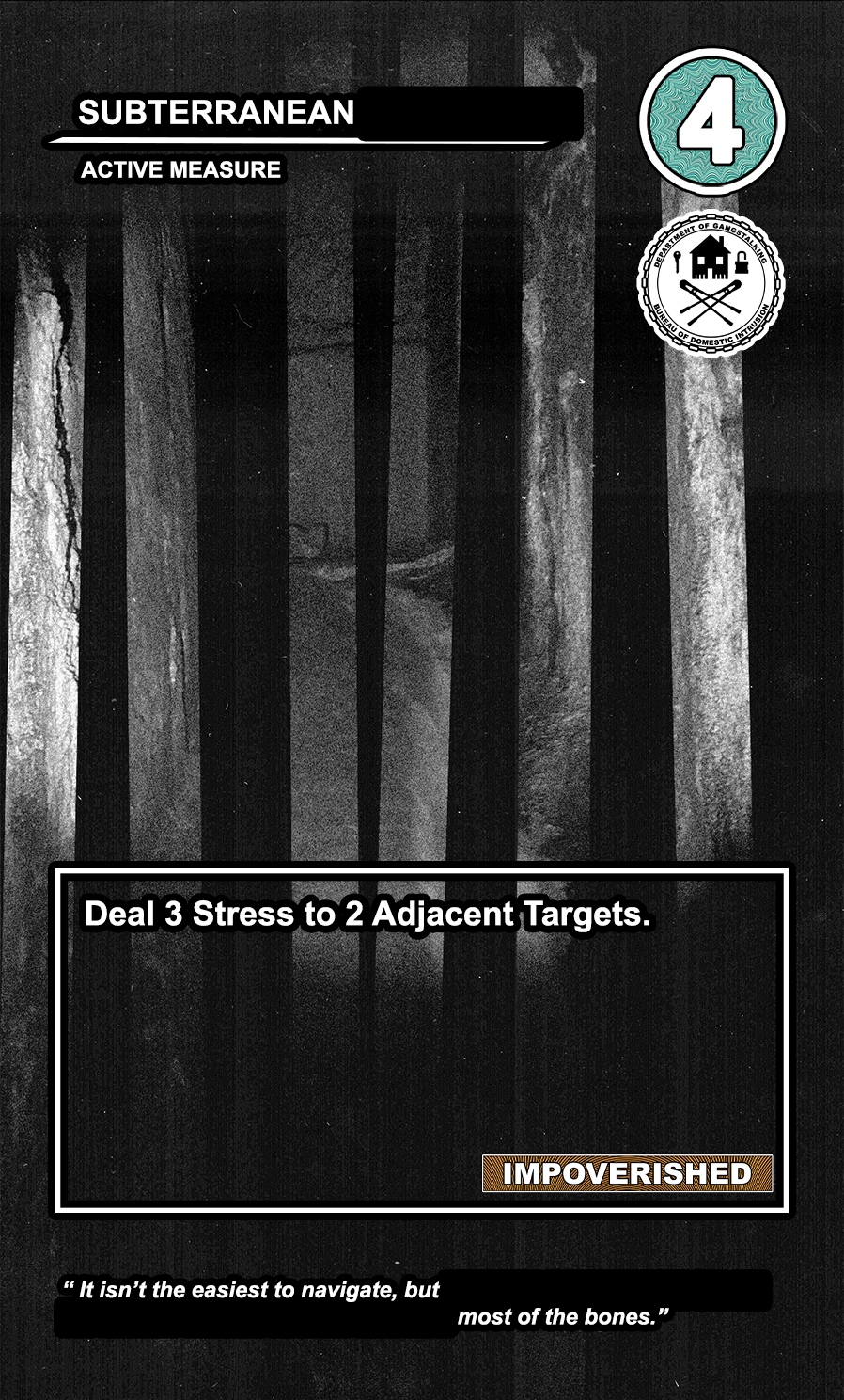 The United States Department of Gangstalking is a game about disinformation, harassment, paranoia, and the collapse of civil society. The game is for 2-4 players who take on the roles of Agents of Gross Cognitive Harm, with the goal of harassing a grid of Targeted Individuals until they become Radicalized. They do this by using Operations cards, which detail various harassment tactics, like covert implants, drugs, mind control, and other forms of manipulation that cause stress to the Targets. When Individuals reach Max Stress, they become Radicalized and cause stress to other Individuals around them, produce rewards for the player that radicalized them, and are removed and replaced with another Targeted Individual. Some Individuals are High Value Targets, like Radio DJs, celebrities, and politicians, and they produce greater rewards and cause more stress when they are Radicalized.