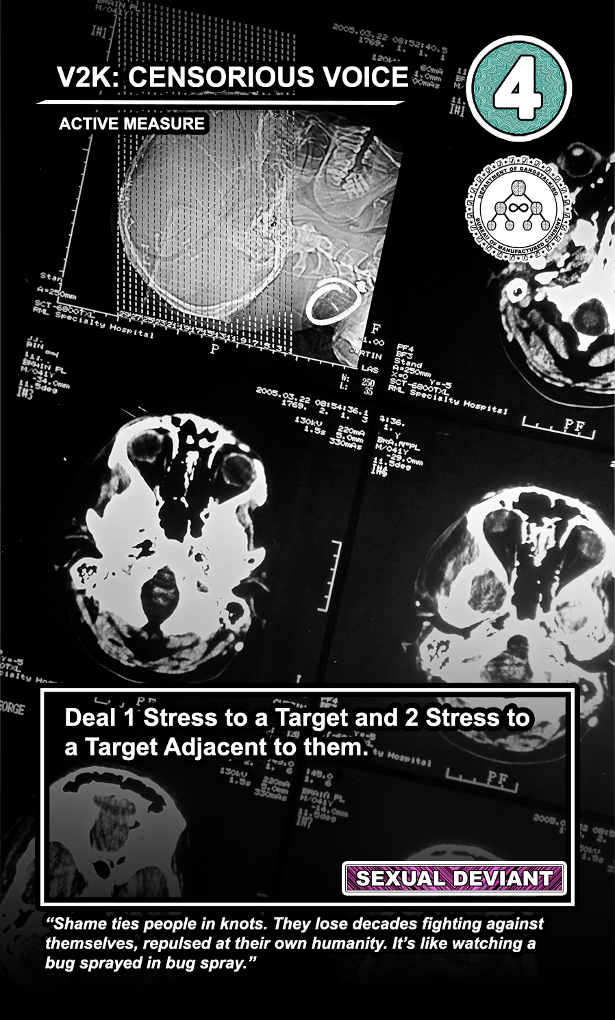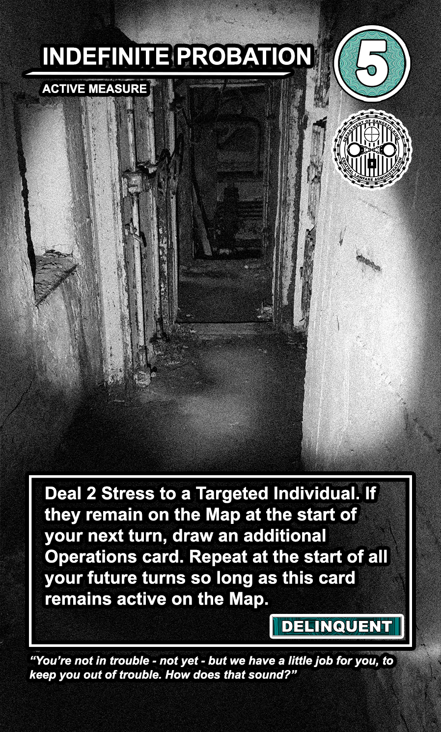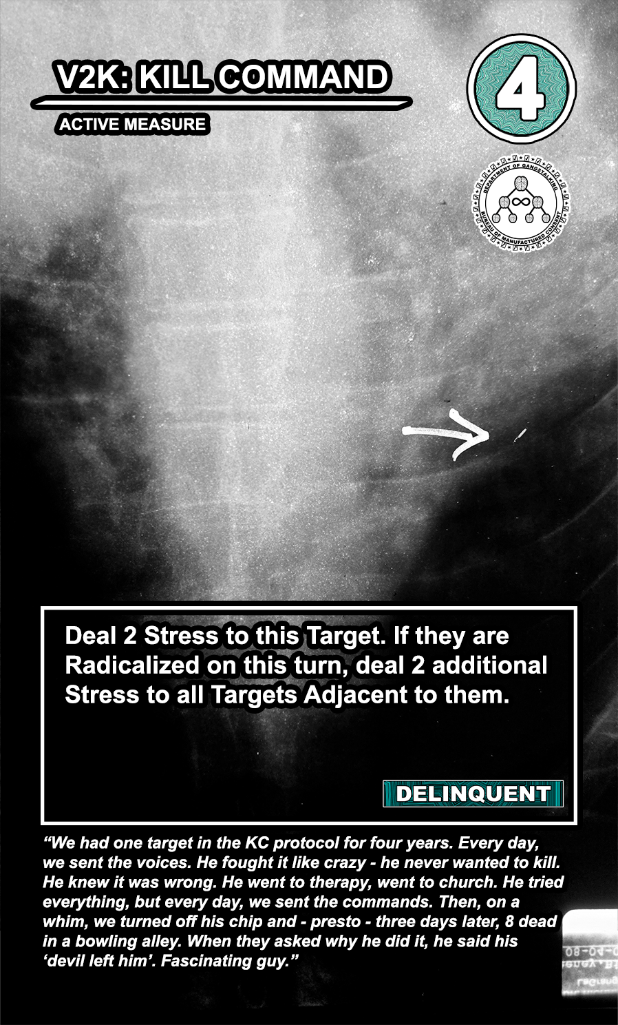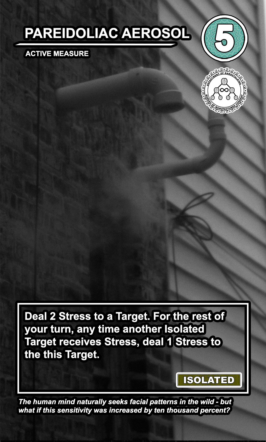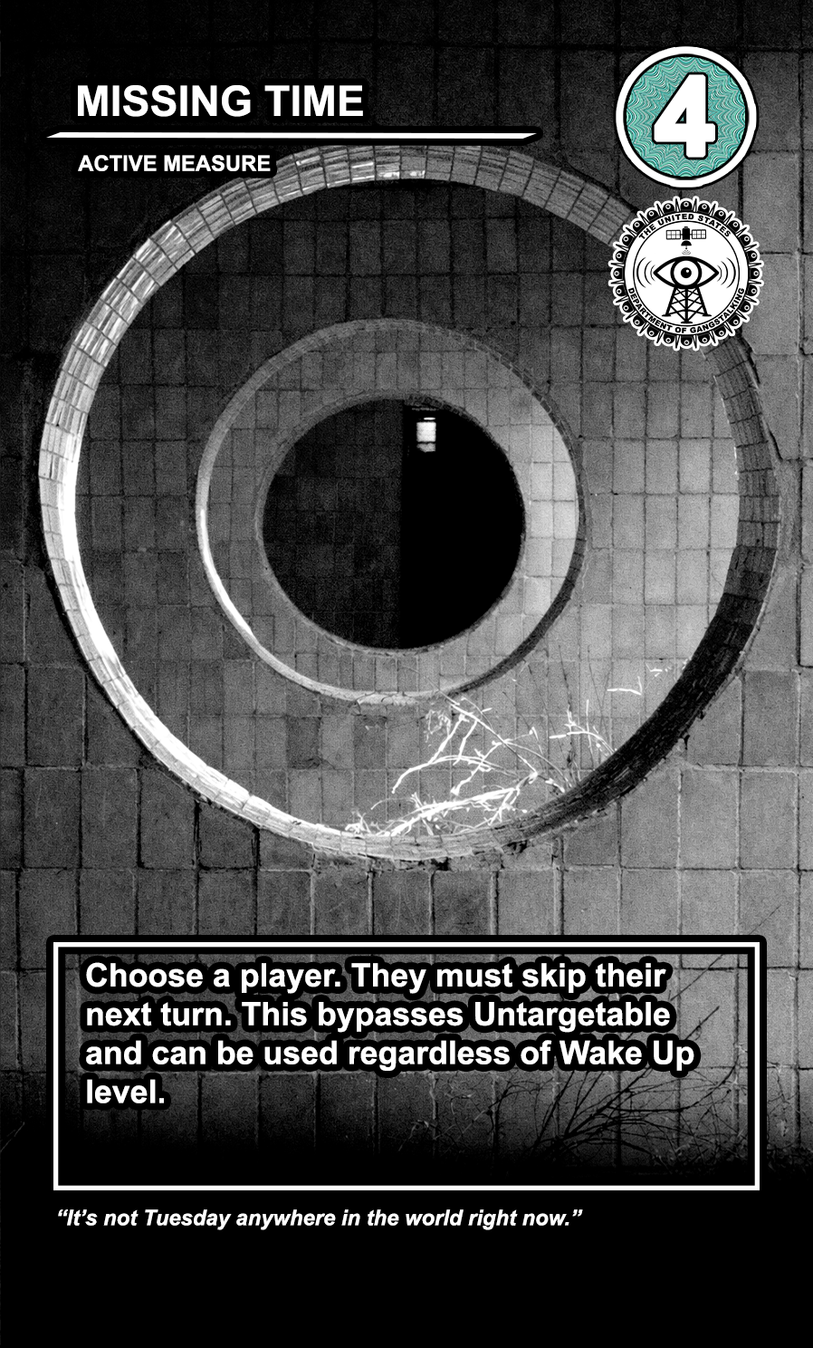 The United States Department of Gangstalking is a game about disinformation, harassment, paranoia, and the collapse of civil society. The game is for 2-4 players who take on the roles of Agents of Gross Cognitive Harm, with the goal of harassing a grid of Targeted Individuals until they become Radicalized. They do this by using Operations cards, which detail various harassment tactics, like covert implants, drugs, mind control, and other forms of manipulation that cause stress to the Targets. When Individuals reach Max Stress, they become Radicalized and cause stress to other Individuals around them, produce rewards for the player that radicalized them, and are removed and replaced with another Targeted Individual. Some Individuals are High Value Targets, like Radio DJs, celebrities, and politicians, and they produce greater rewards and cause more stress when they are Radicalized.