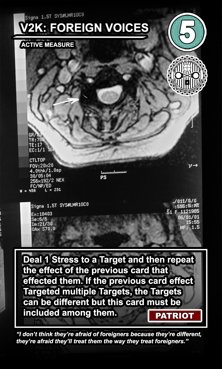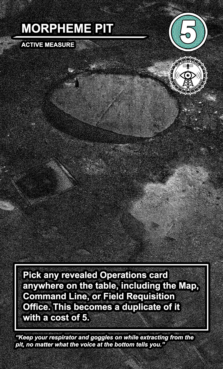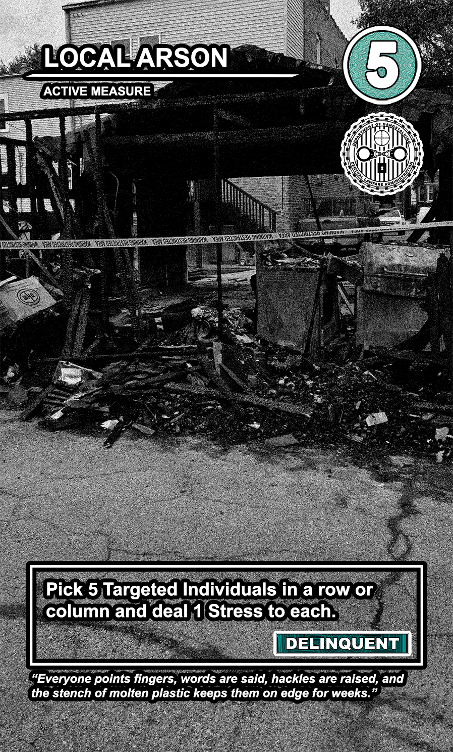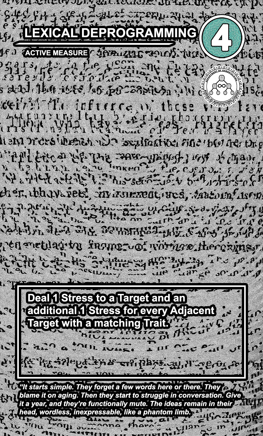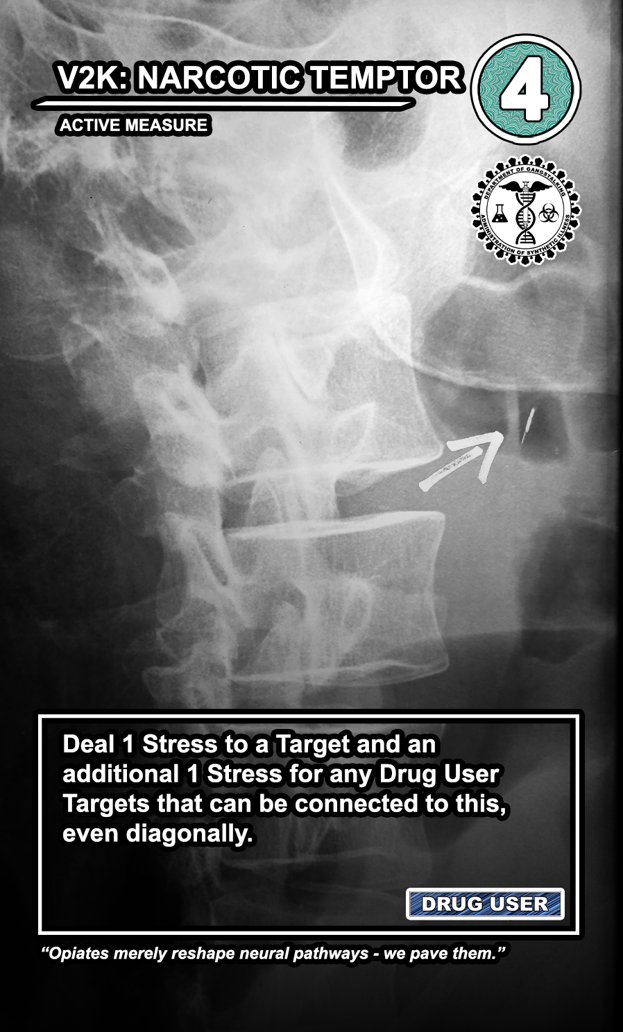 The United States Department of Gangstalking is a game about disinformation, harassment, paranoia, and the collapse of civil society. The game is for 2-4 players who take on the roles of Agents of Gross Cognitive Harm, with the goal of harassing a grid of Targeted Individuals until they become Radicalized. They do this by using Operations cards, which detail various harassment tactics, like covert implants, drugs, mind control, and other forms of manipulation that cause stress to the Targets. When Individuals reach Max Stress, they become Radicalized and cause stress to other Individuals around them, produce rewards for the player that radicalized them, and are removed and replaced with another Targeted Individual. Some Individuals are High Value Targets, like Radio DJs, celebrities, and politicians, and they produce greater rewards and cause more stress when they are Radicalized.
