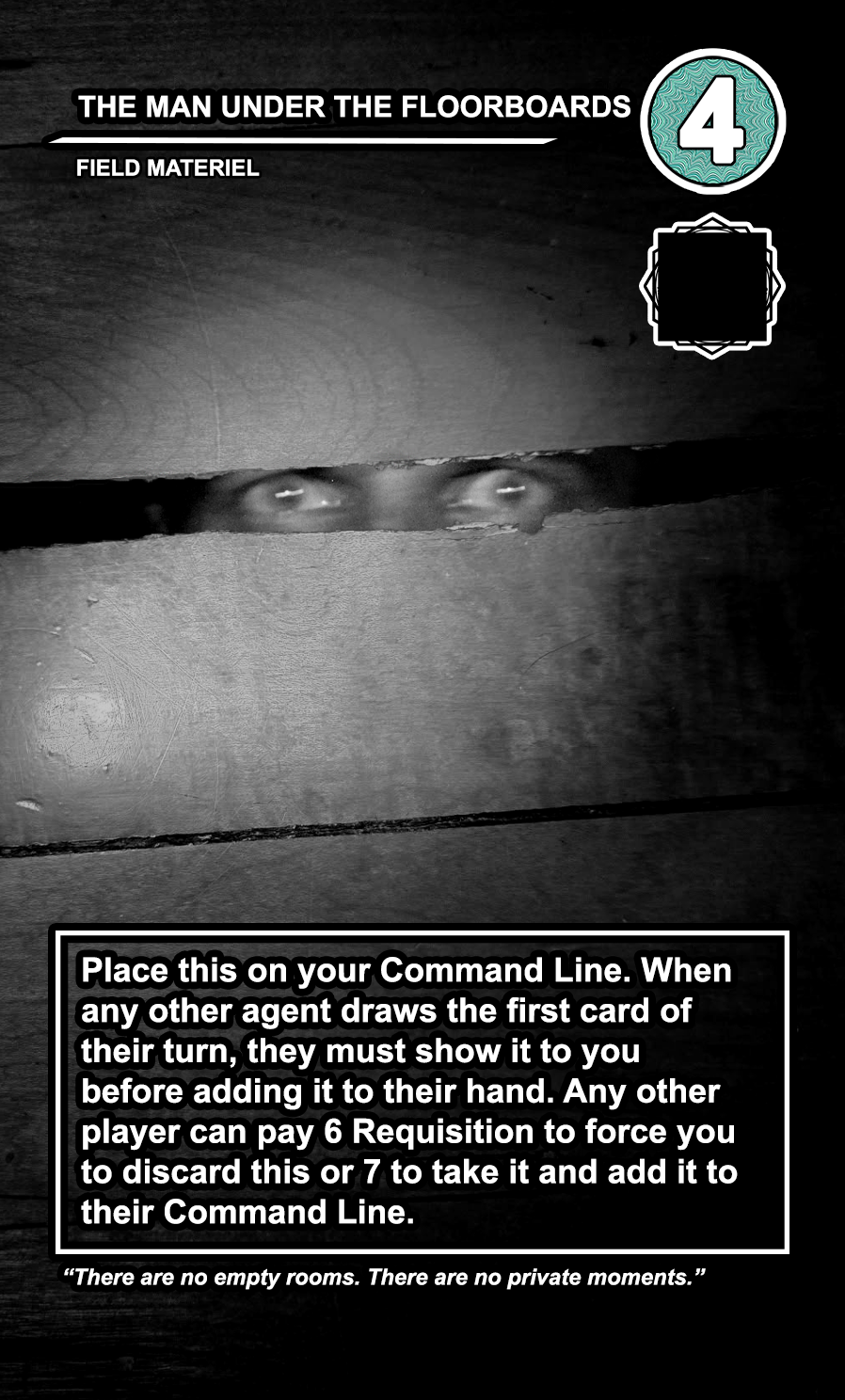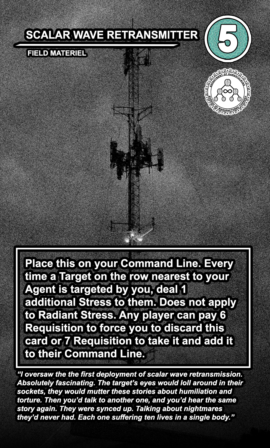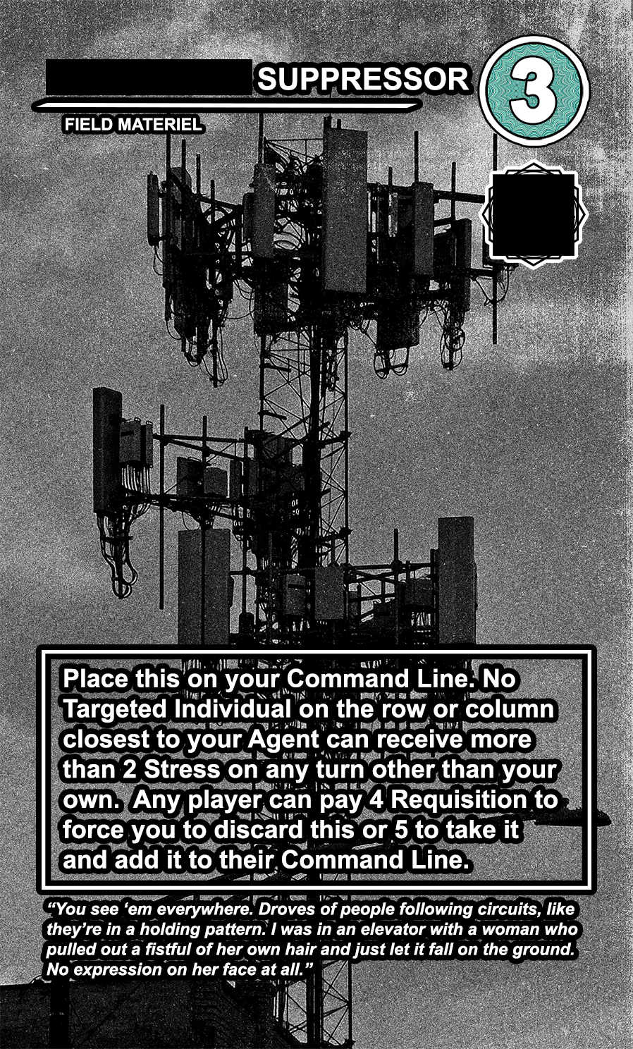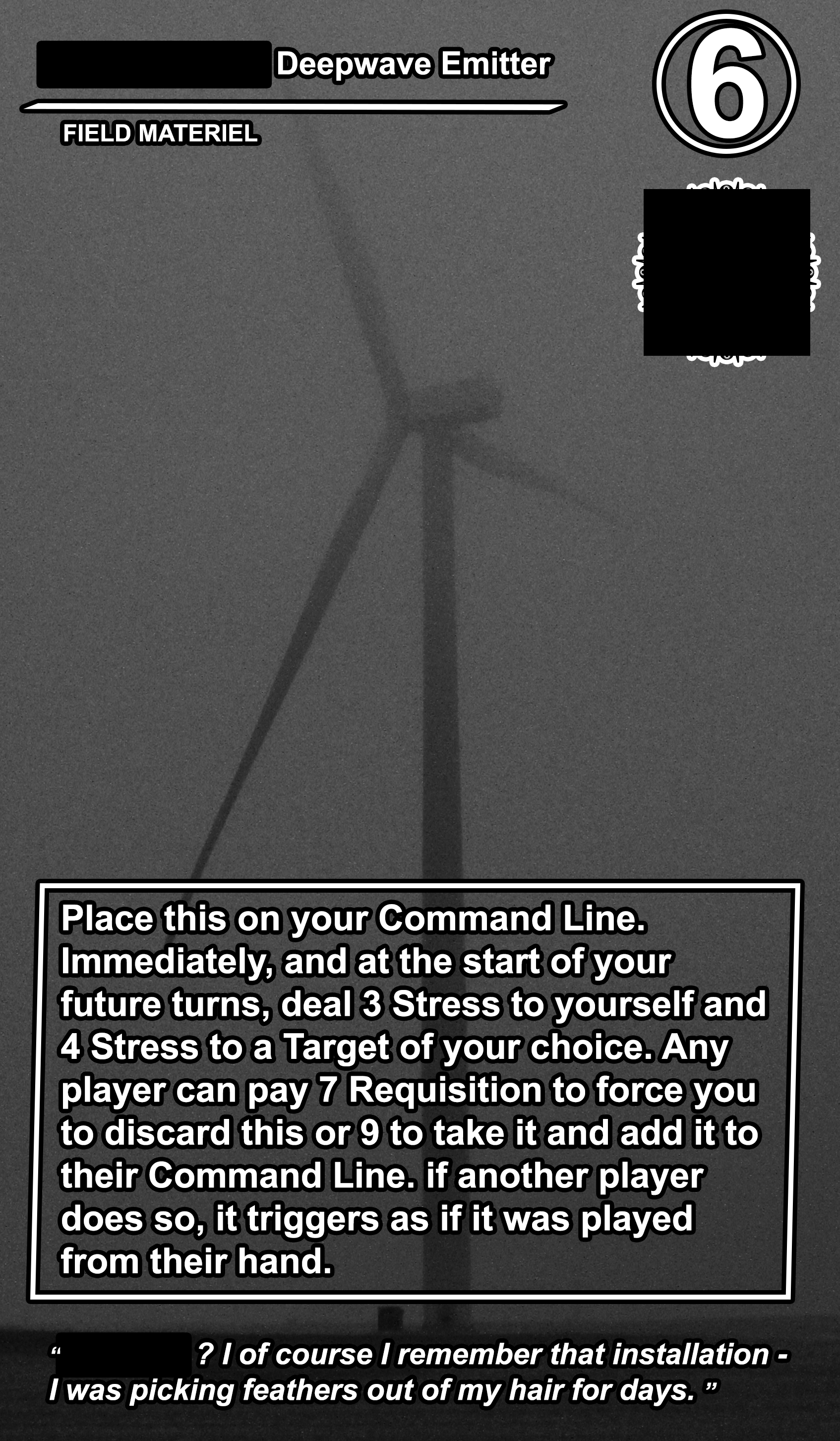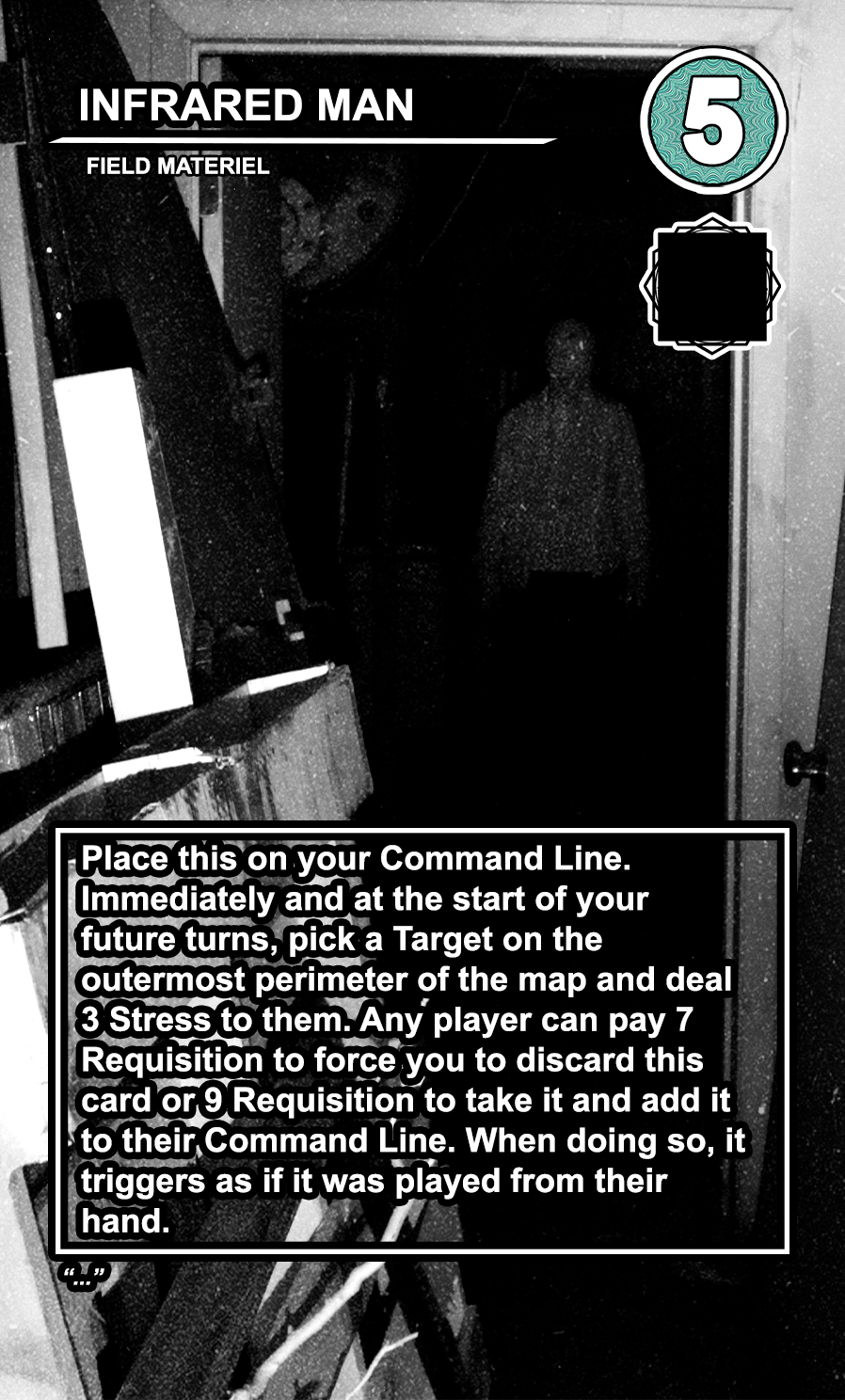 Within the OPERATIONS deck, the FIELD MATERIEL cards are high-cost, high-value semi-permanent pieces of equipment that can be played directly to any of the 4 COMMAND LINE slots available to every player. While they are generally very costly to play, they usually provide the player with a special action that can be taken at every turn. Other players can pay a high amount of requisition to destroy them, and an even higher amount to take them and directly add them to their COMMAND LINE.