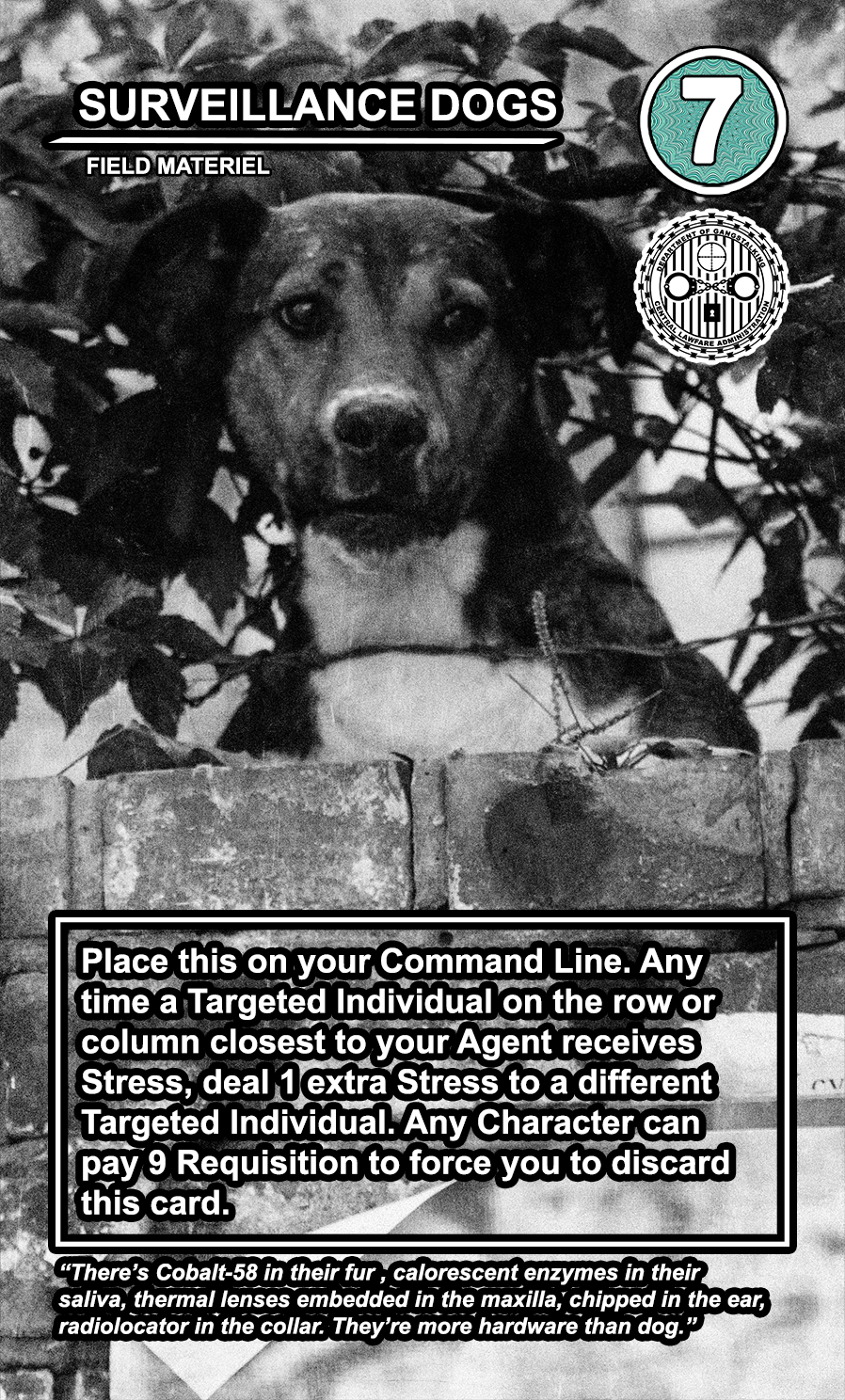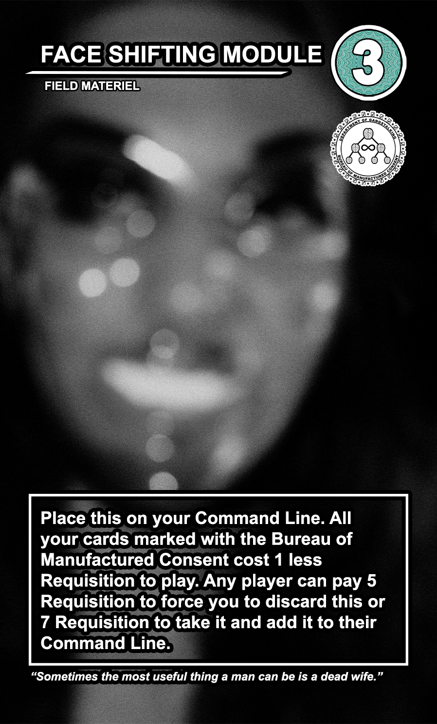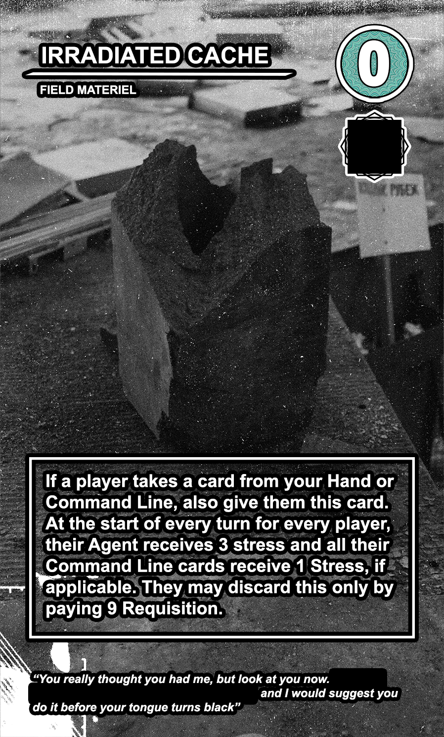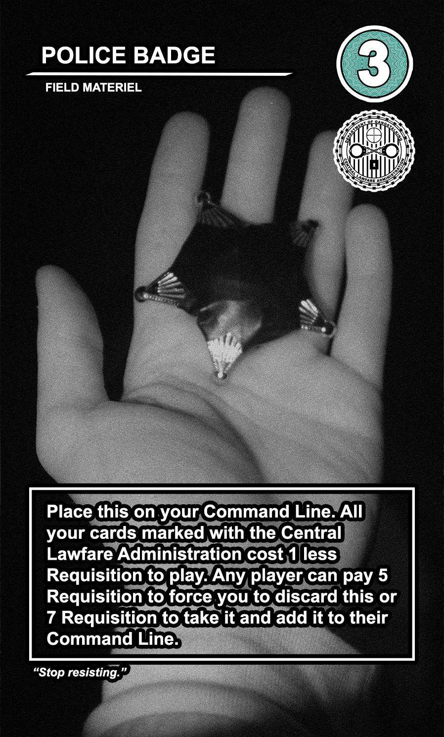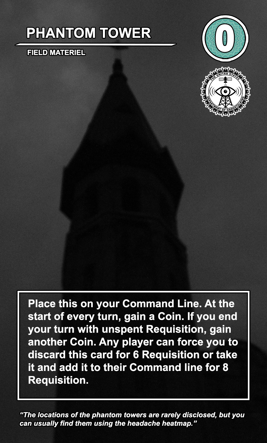 Within the OPERATIONS deck, the FIELD MATERIEL cards are high-cost, high-value semi-permanent pieces of equipment that can be played directly to any of the 4 COMMAND LINE slots available to every player. While they are generally very costly to play, they usually provide the player with a special action that can be taken at every turn. Other players can pay a high amount of requisition to destroy them, and an even higher amount to take them and directly add them to their COMMAND LINE.