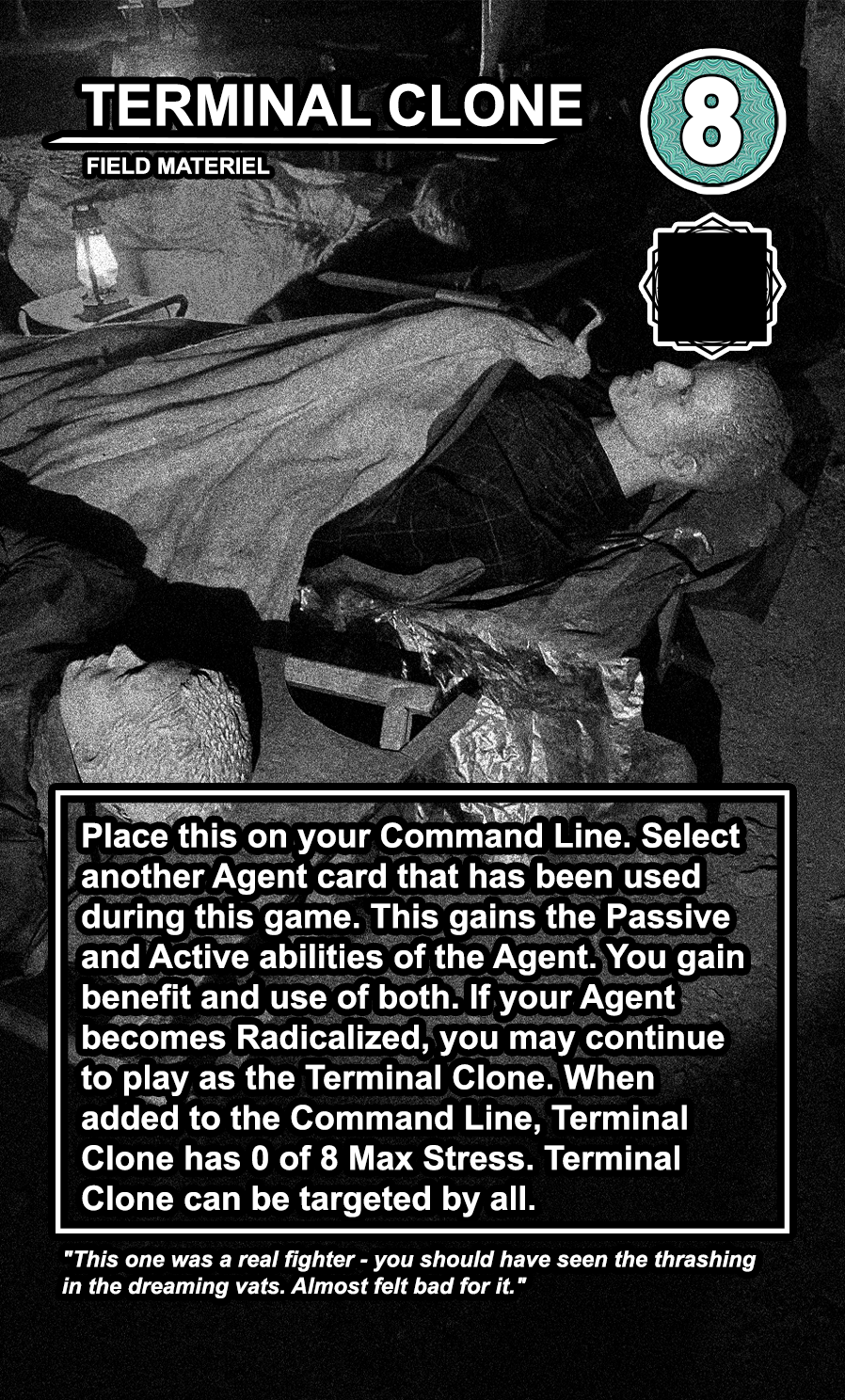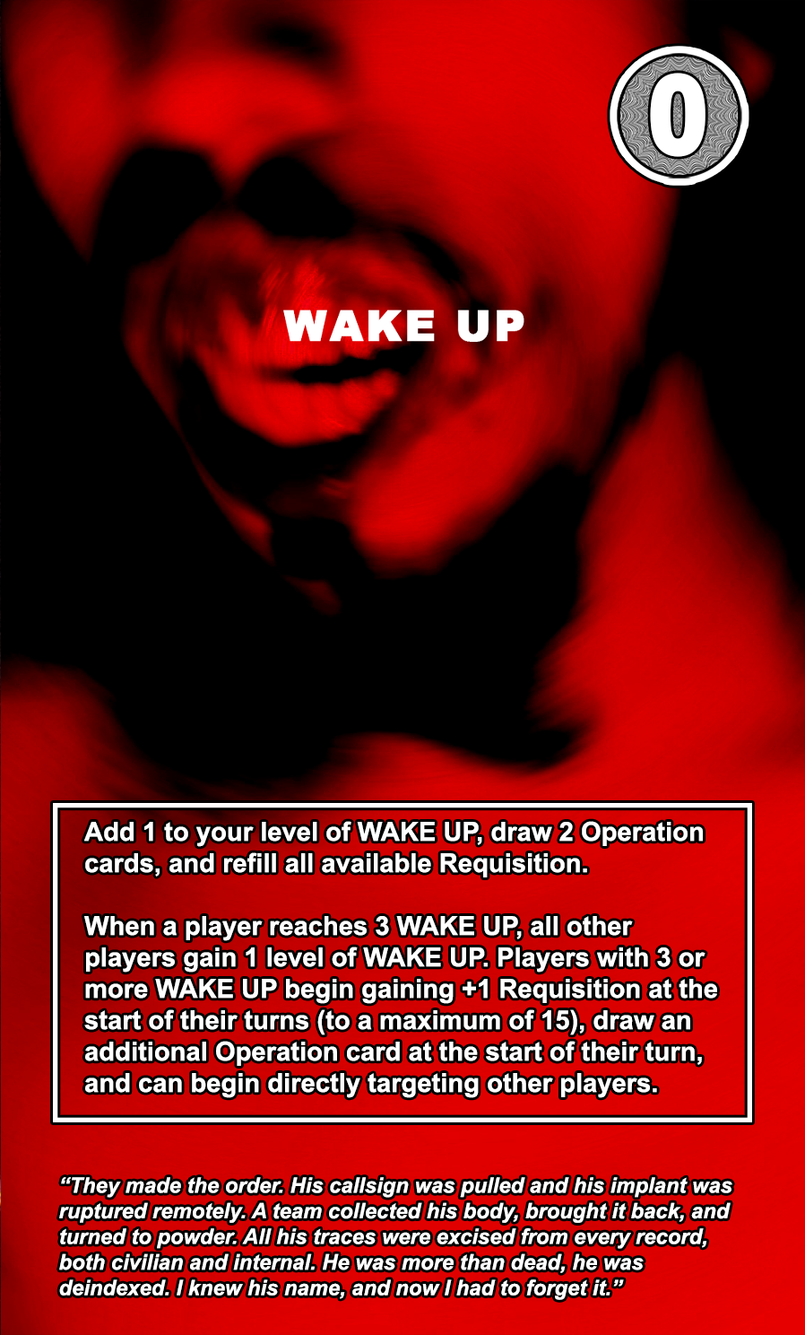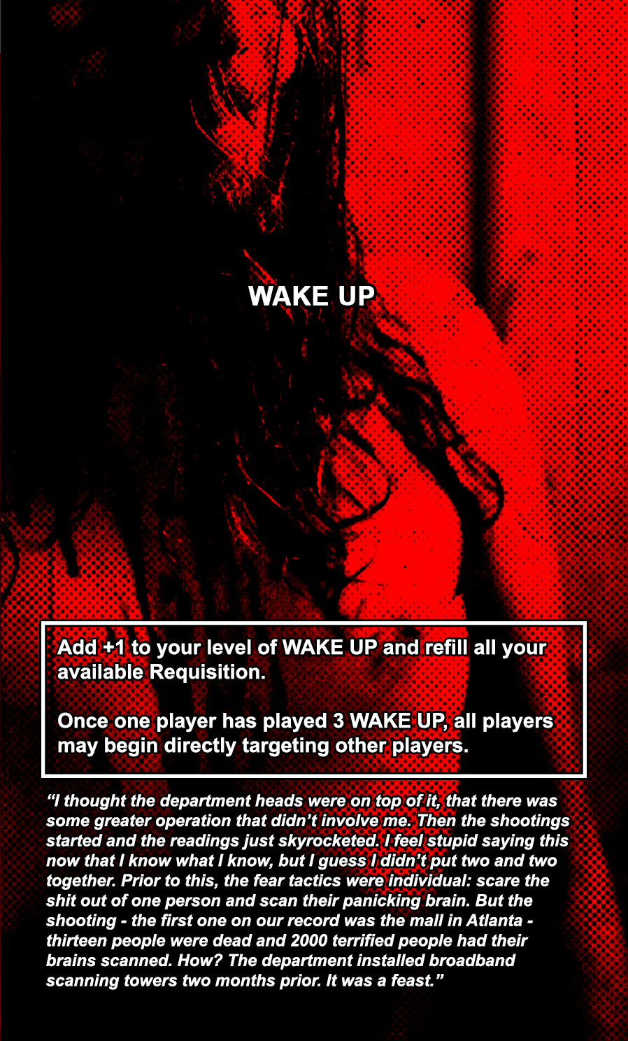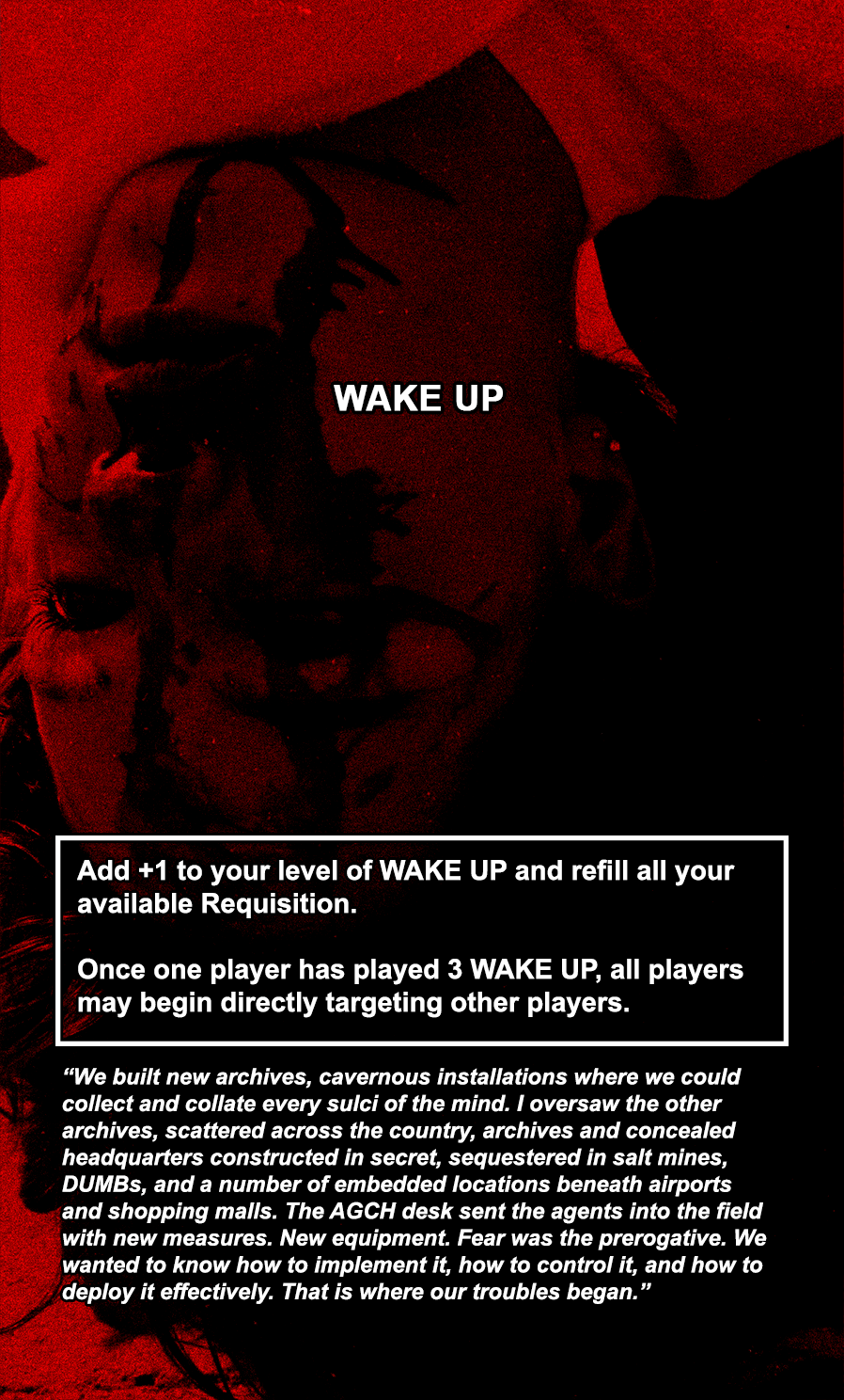 Throughout the Operations deck, there are numerous cards that say WAKE UP. When a player uses one of these cards, it immediately refills their current maximum Requisition (the resource they use to play cards and use abilities) and increases their “WAKE UP” level by 1 point. When a player has 3 WAKE UP points, all players gain the ability to target other players. Agents can withstand very high amounts of stress, so targeting them while targeting other Individuals is crucial.