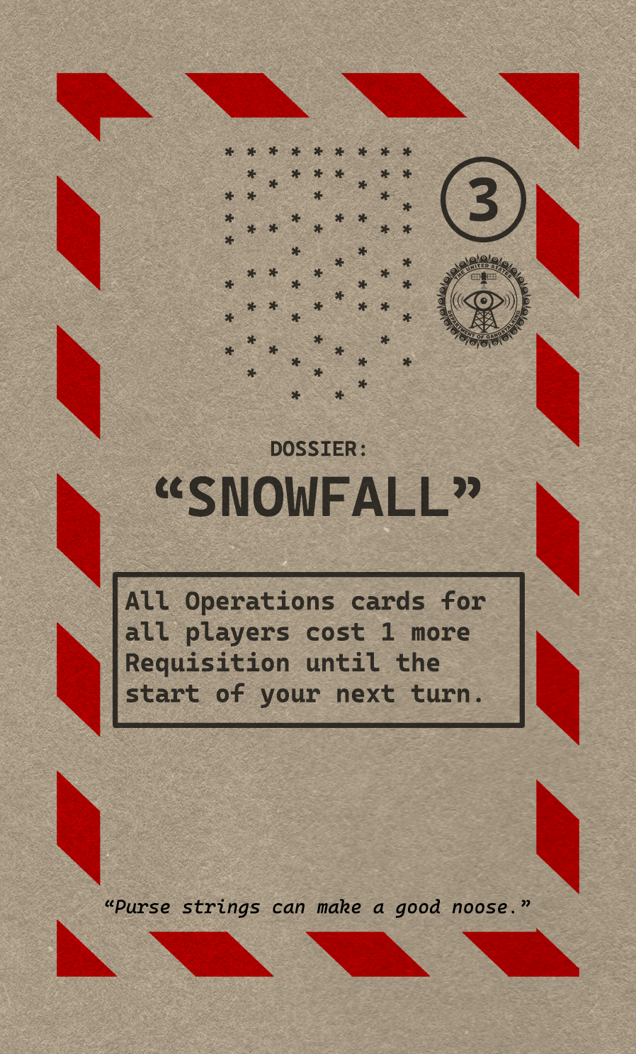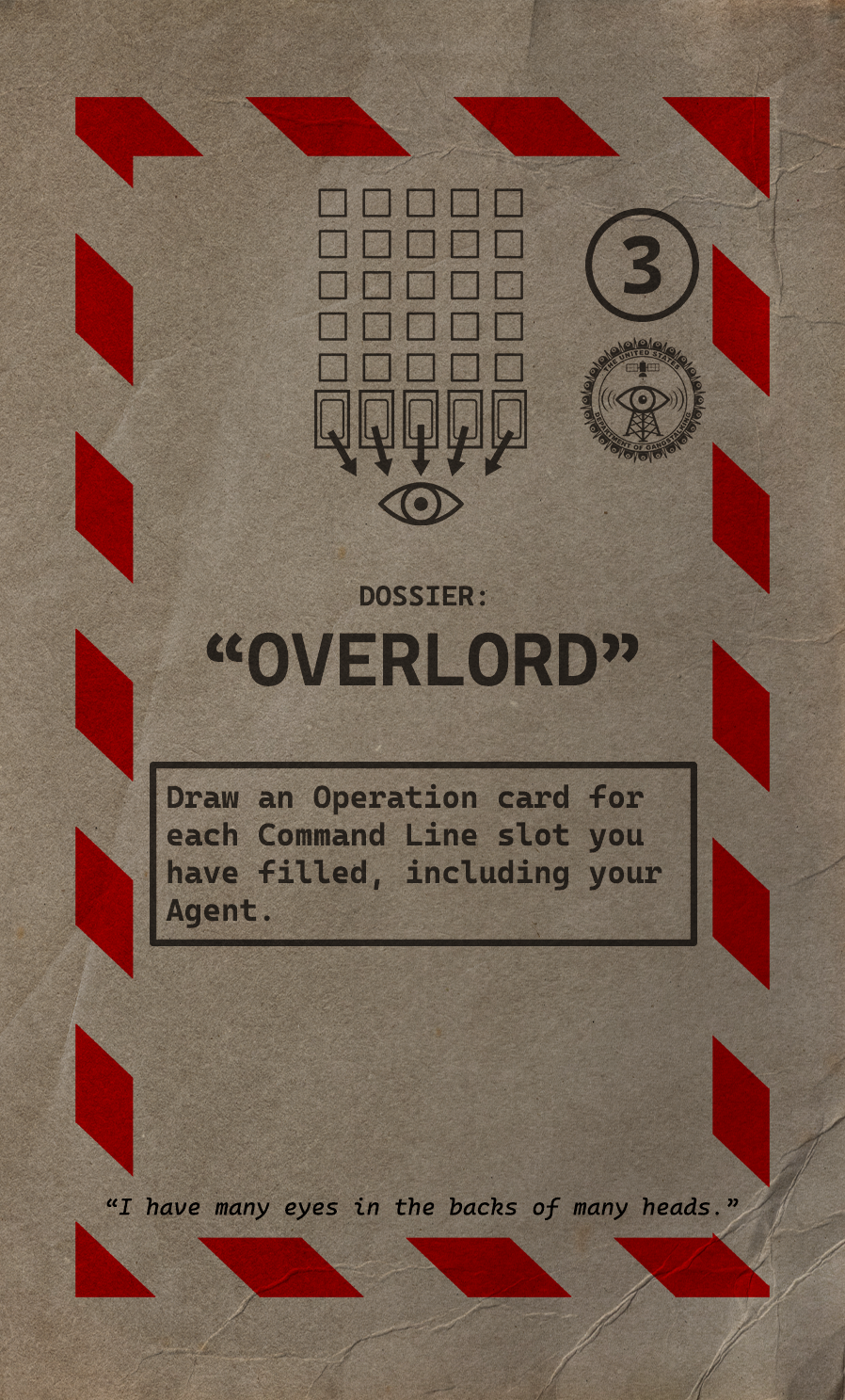 Dossier cards allow players to gain more cards, information, protection, or board control, without causing direct Stress to a Target.