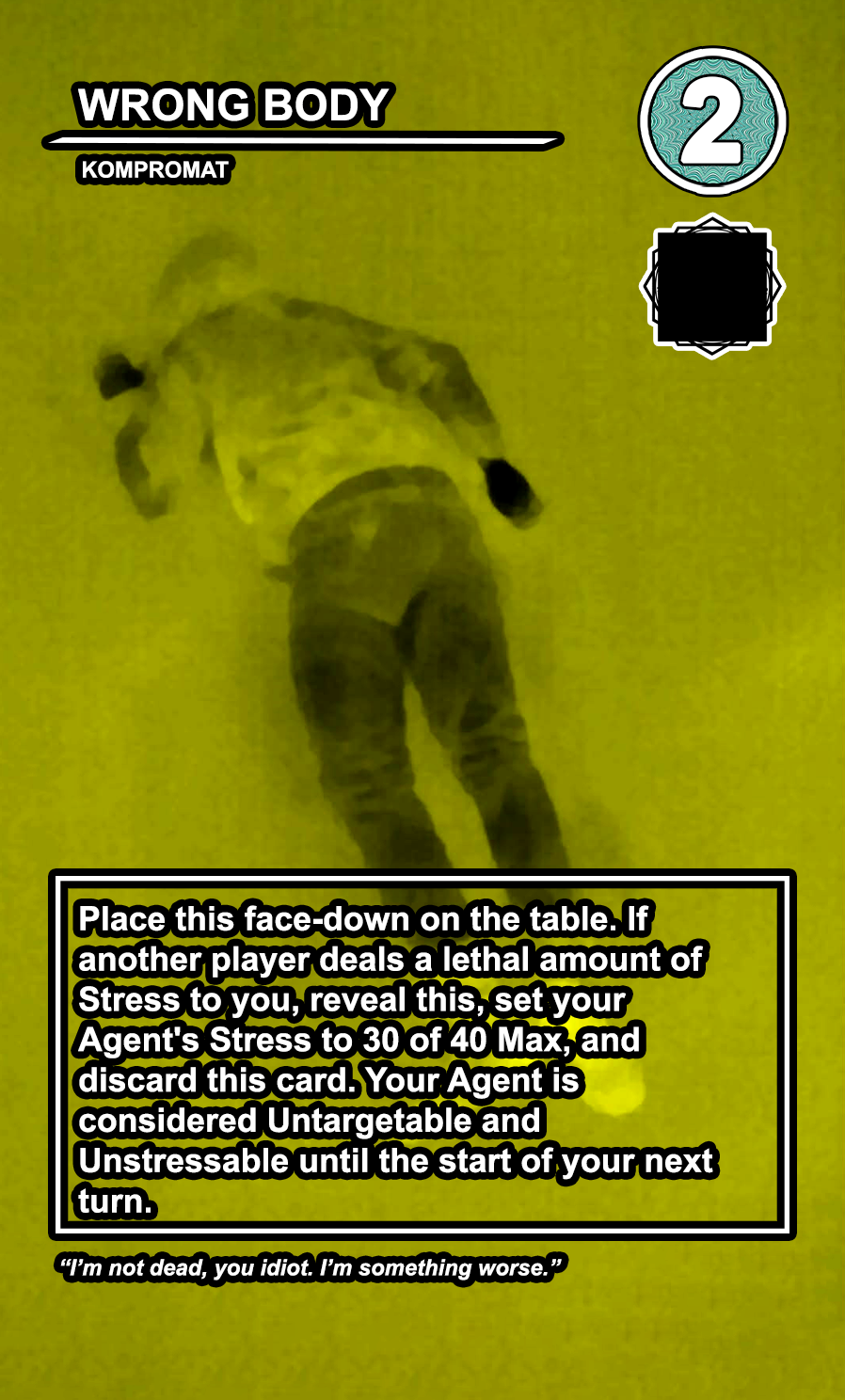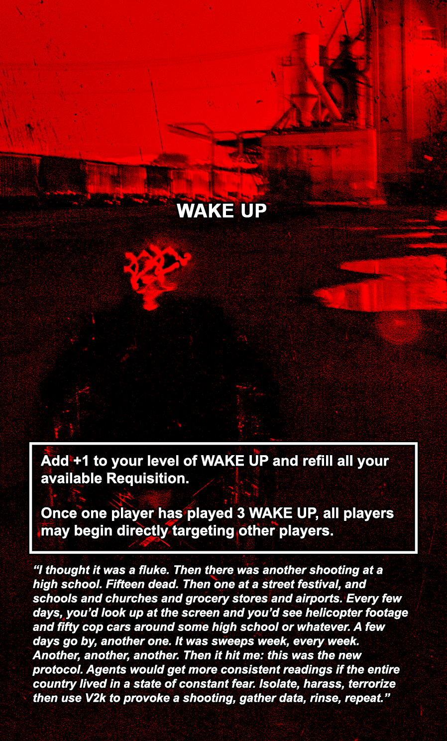Place this face-up on the table and restore all your available requisition. Once any player has played at least 3 WAKE UP cards, the game enters COLLAPSE. Once in COLLAPSE, any player can target any other player directly. During COLLAPSE, playing a WAKE UP card will either Destress your Agent for 4 OR cause 3 Stress to your Agent and restore all available Requisition.