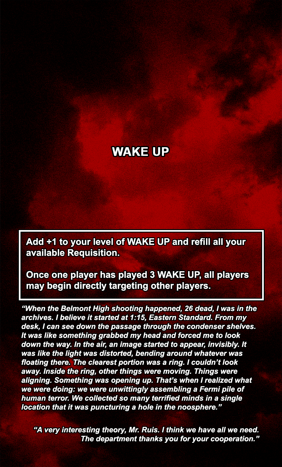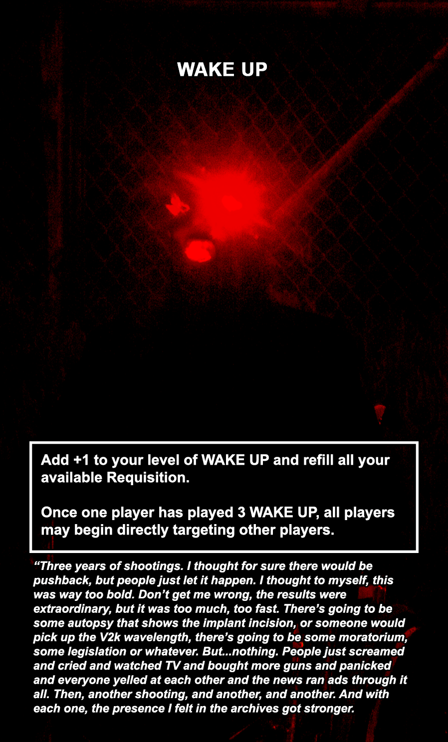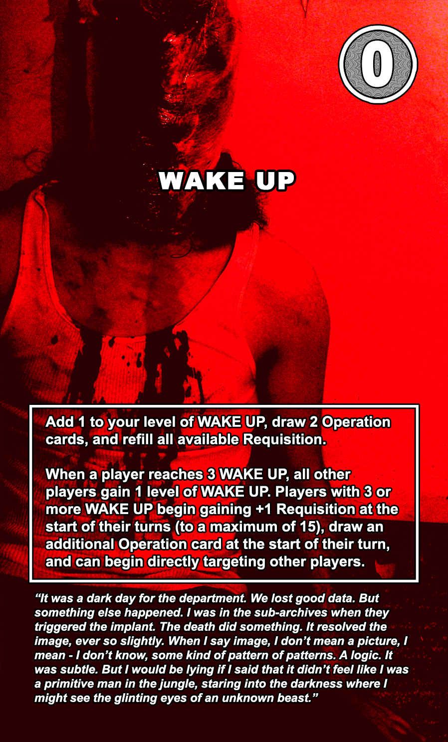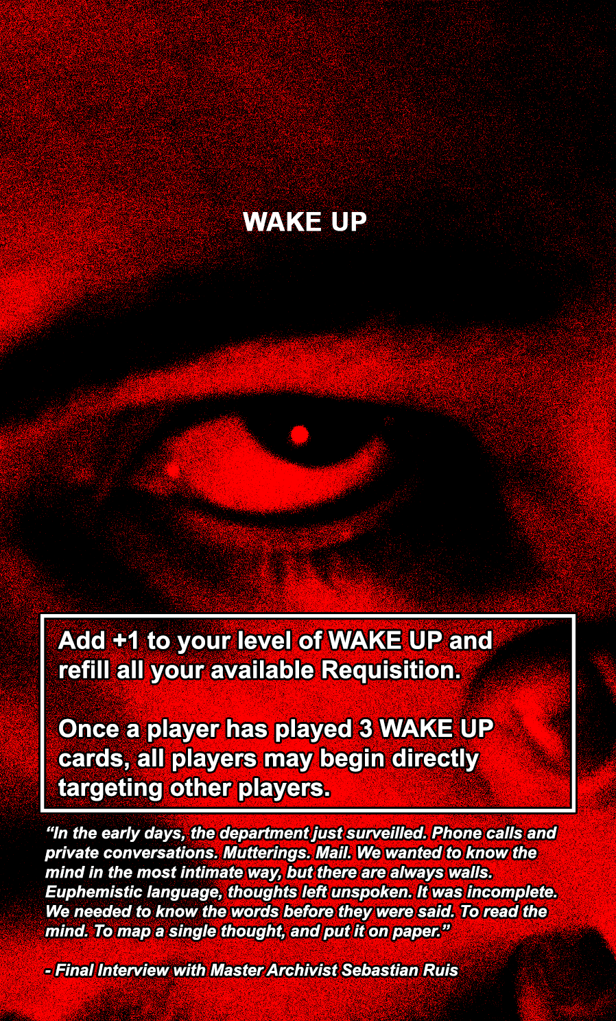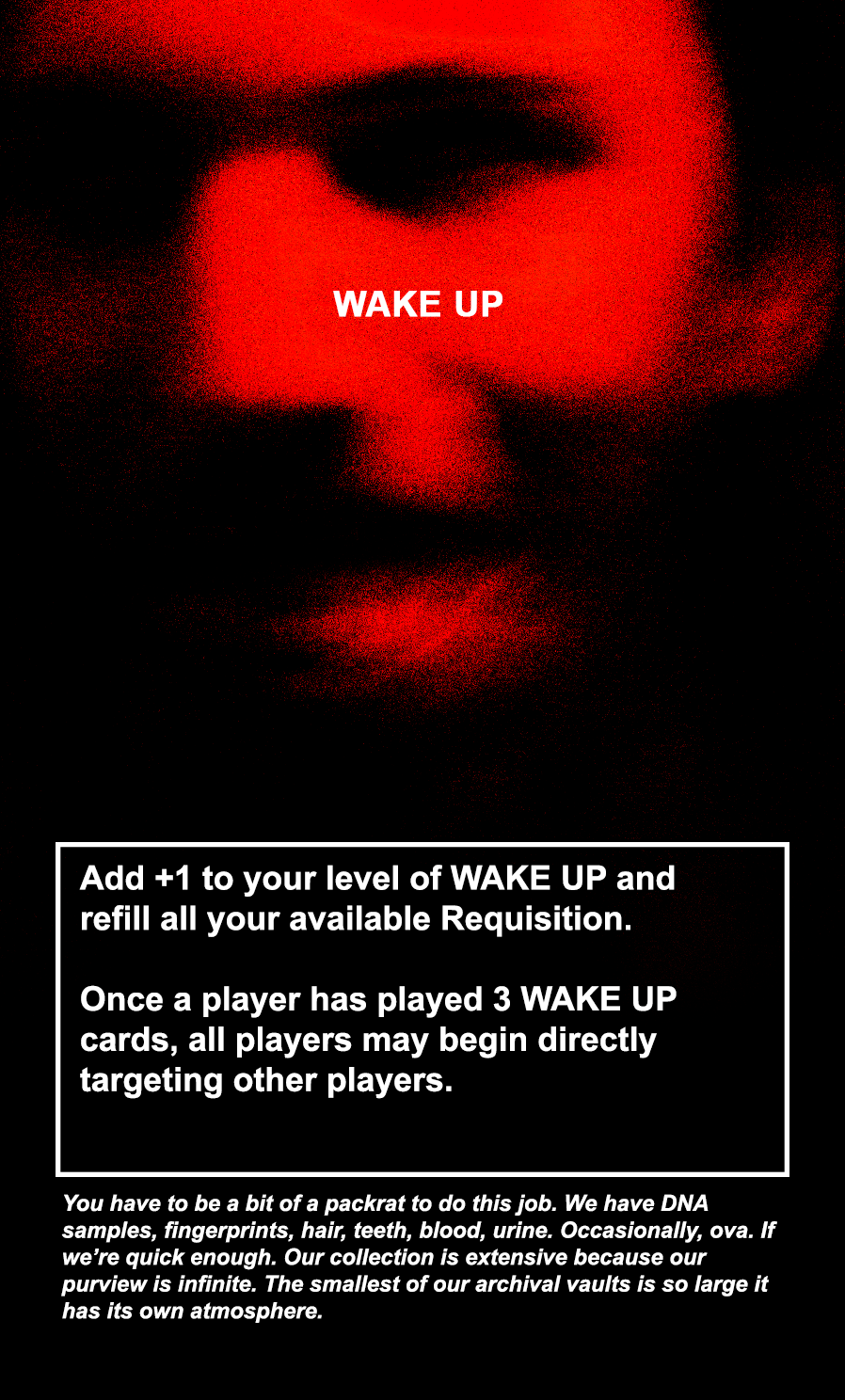 The WAKE UP cards are the most powerful cards in the game, allowing the player to completely restore their available Requisition. The core storyline of the game will be delineated across all 30 WAKE UP cards, with each card containing a paragraph from an interview with the master archivist of the USDG.