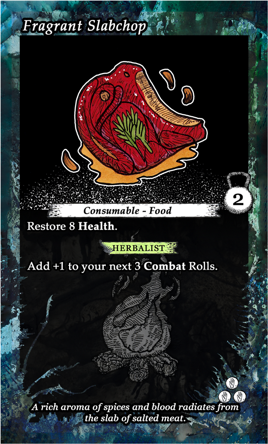 Fragrant Slabchop (left) - This is a Consumable - Food Item that weighs 2 and has can be used once. 8 Armor. If a Herbalist is carrying it, they gain access to the Herbalist Trait bonus.